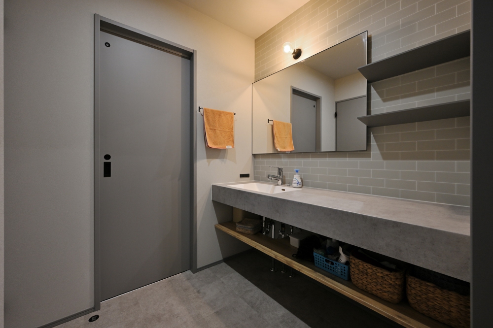 人気のアイカの洗面台。グレーと木目のコーディネートで小さな空間にもこだわっている。広々としたカウンターなので家族並んでも、スムーズに準備ができる。