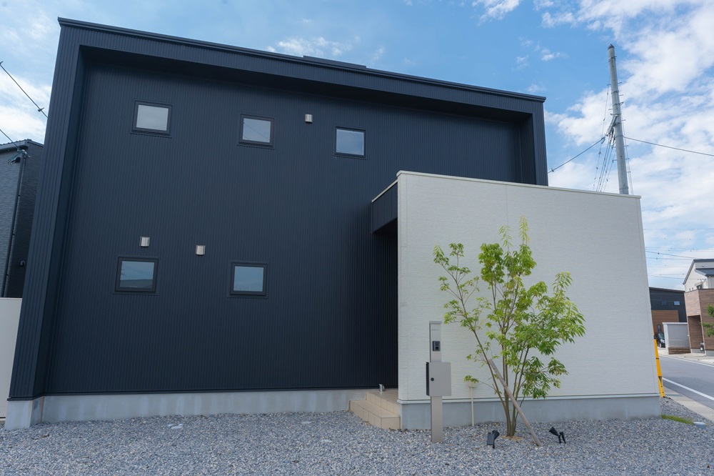 直線的なフォルムに黒い外壁が映える。前面道路側の窓は極力小さくして、防犯面にも配慮した。合計4台が駐車できる