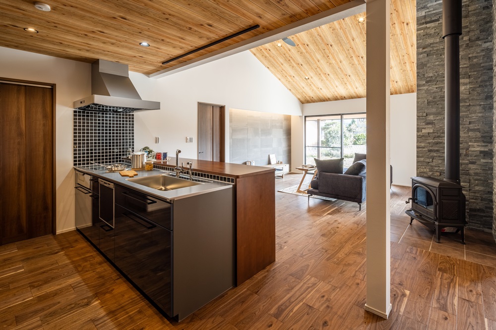 人気のオープンキッチンは家族の様子が良く分かる。キッチンの前面には収納を採用。