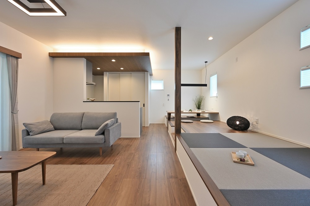 小上がりの和室があるLDK。パントリーから水回りまで回遊できるスムーズな家事動線