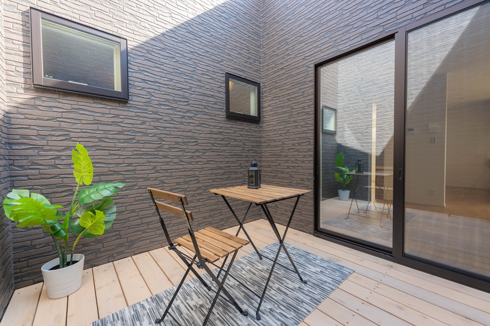家の中央に配した中庭。のんびりお茶をしたり、親しい友人と集まってのBBQも