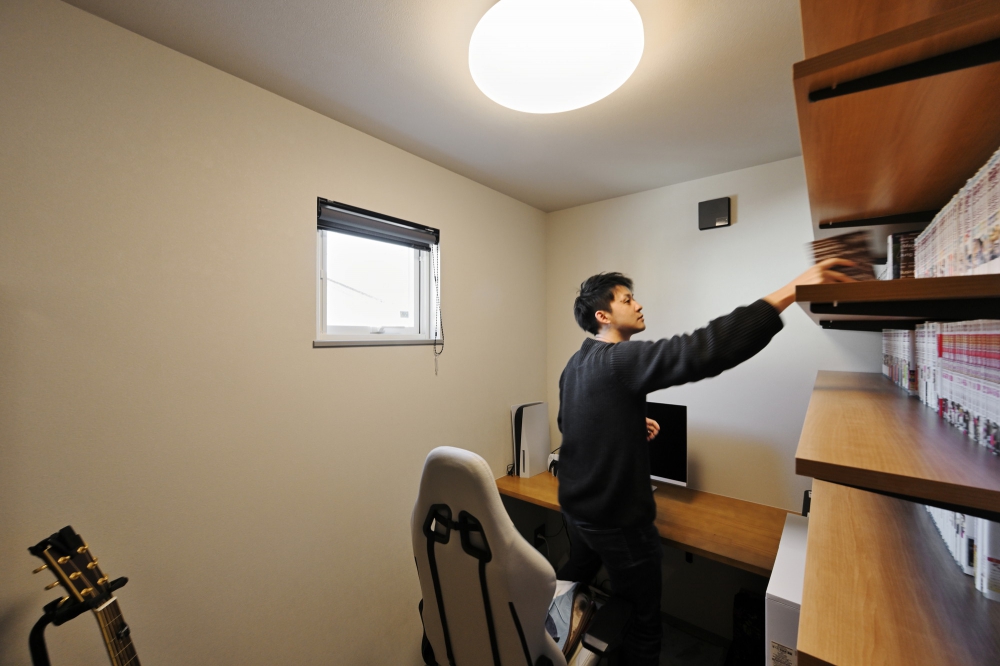 3帖の書斎はリモートワークをしたり、趣味のギターを楽しめる。 デスクは造作で、横には可動棚を設置しプリンターや本などサイズに合わせて使用可能。