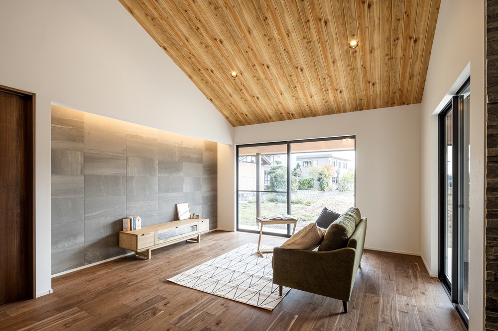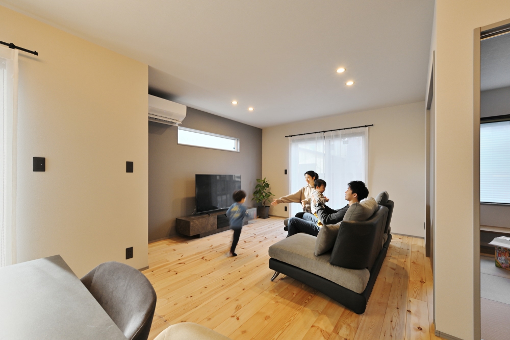 リビングの一面に、グレーのアクセントクロスを。床はパイン材を採用。夏はさらりとした風合いで、冬は温かみを感じられて心地よく過ごすことができる。