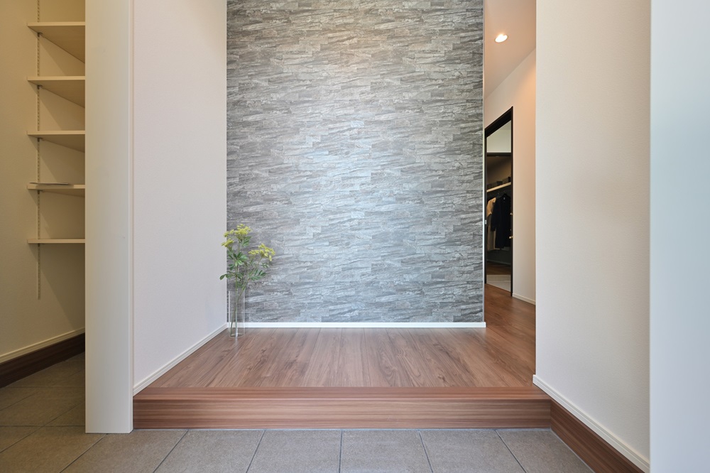 広々としたエントランス。コンクリート調の壁面を間接照明が照らし、趣のある表情。左手にはシューズインクローゼットを設けている