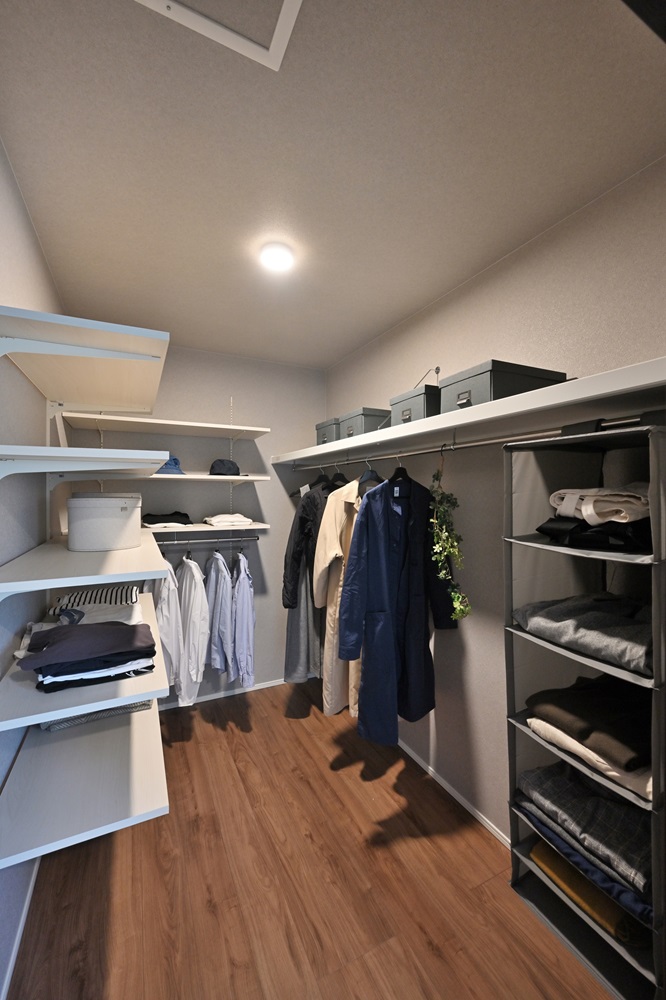 大容量のウォークインクローゼット。季節ものなど、すべてを一元管理できるゆとりの収納量。置き家具を減らせるから、各居室を広く使える