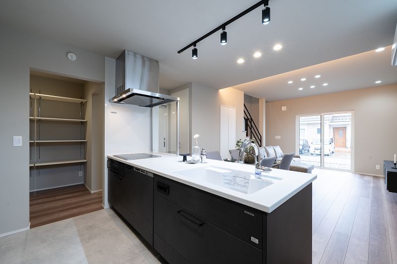 料理をしながらリビング全体を見渡せる設計で、家族とのコミュニケーションがとりやすい配置。 奥にはパントリーがあり、食品やキッチン用品をスッキリと収納できます。