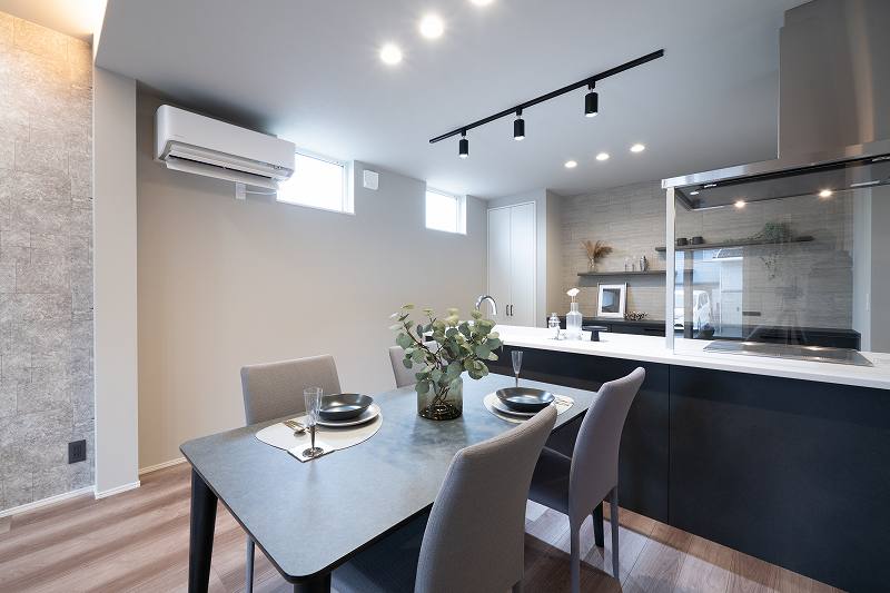 リビングは、高天井と奥行きを活かした設計により、空間に広がりを感じられる開放的な仕上がり。 間取りの工夫で、数字以上に「広さ」を実感できると好評! 内装は、グレーと木目を基調にしたモノトーン調でまとめられ、スタイリッシュで落ち着いた印象に。 また、階段下を収納スペースとして有効活用することで、生活感を抑えたすっきりとした空間が保たれています。