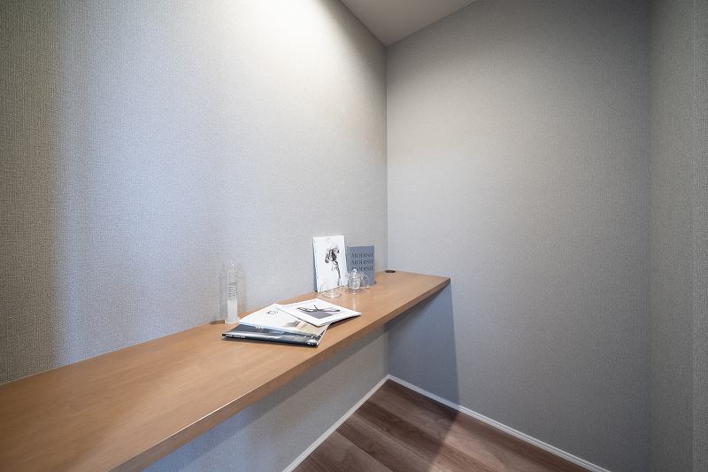 ちょっとした作業に便利なカウンターが設けられており、書き物やパソコン作業ができる機能的な空間となっています。 グリーンのアクセントクロスが落ち着きとリラックス感を演出し、居心地の良い環境を提供してくれます。