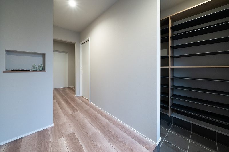 大容量のシューズクロークは家族全員分の靴はもちろん、ベビーカーやアウトドア用品、スポーツ道具まで収納できます。 壁には小物を飾れるニッチを設け、玄関全体の雰囲気に遊び心をプラスしています。