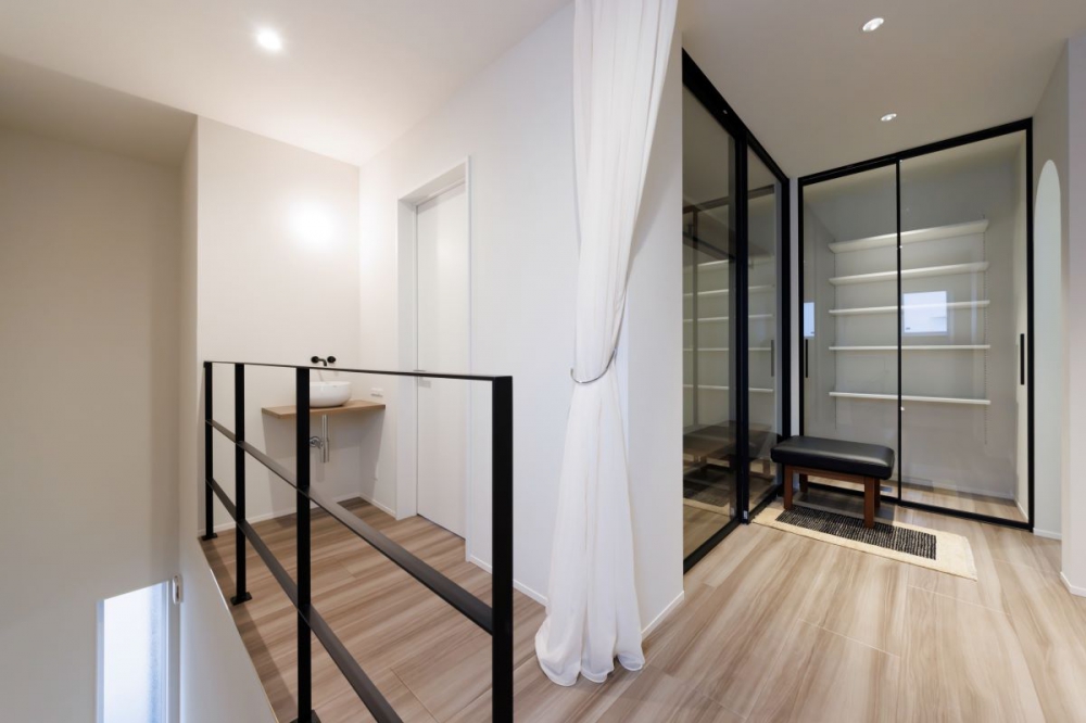 透明なガラスの建具や、さらりと流れるカーテンをあしらうことで、まるで街のセレクトショップにいるような特別な雰囲気を演出しました。 お気に入りの服が美しく透けて見える空間は、毎日のおしゃれをワクワクする時間に変えてくれます。