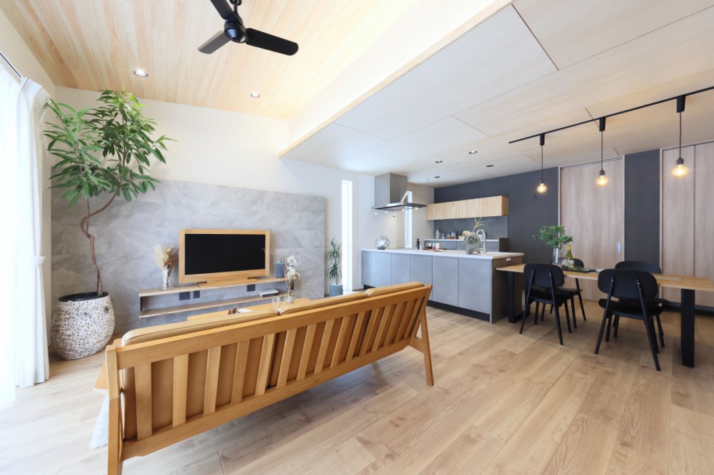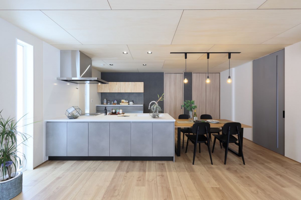 キッチンとダイニングを横一列に配置し、配膳や片付けの動線をスムーズに。 質感豊かなグレーのキッチンと、温もりある木目調の天井が美しく調和するダイニングキッチンに仕上がっています。