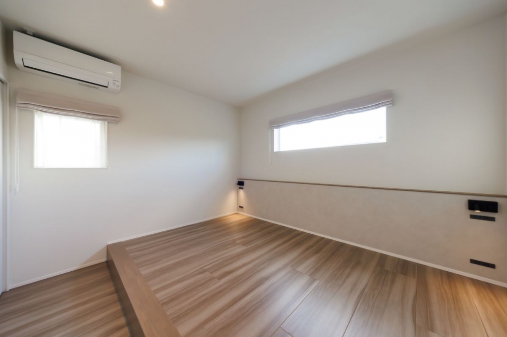小上がりの段差が空間にリズムを生み出していて、とても落ち着く雰囲気の寝室になっています。