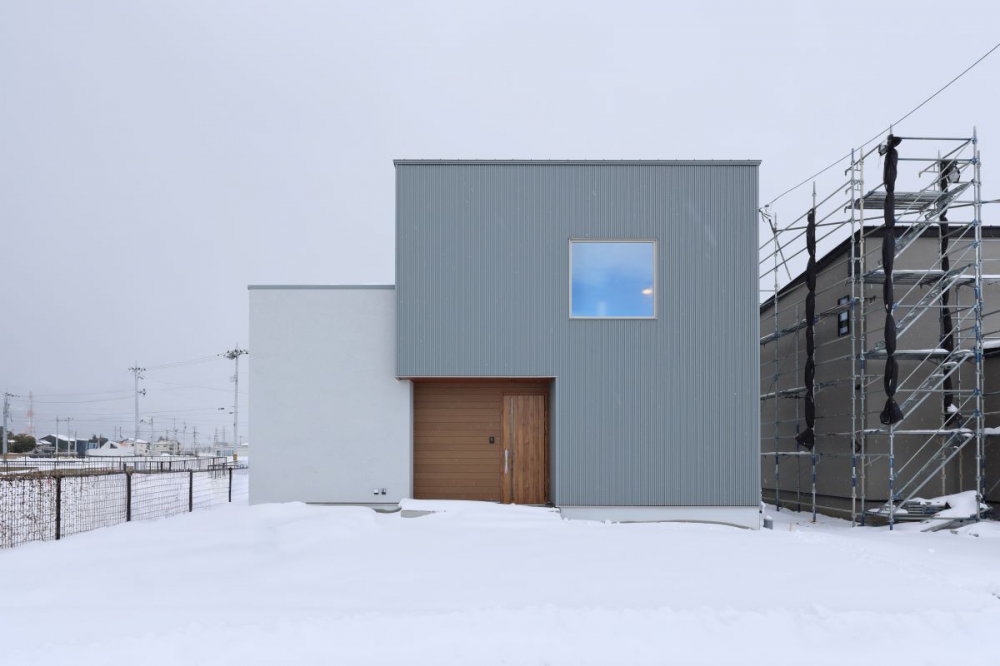 ガルバリウムと塗り壁を組み合わせた、スタイリッシュなキューブ型の外観デザイン。 温かみのある木目調の玄関ポーチが絶妙なコントラストを生み出すモダンな外観で計算された異素材ミックスのデザインです。