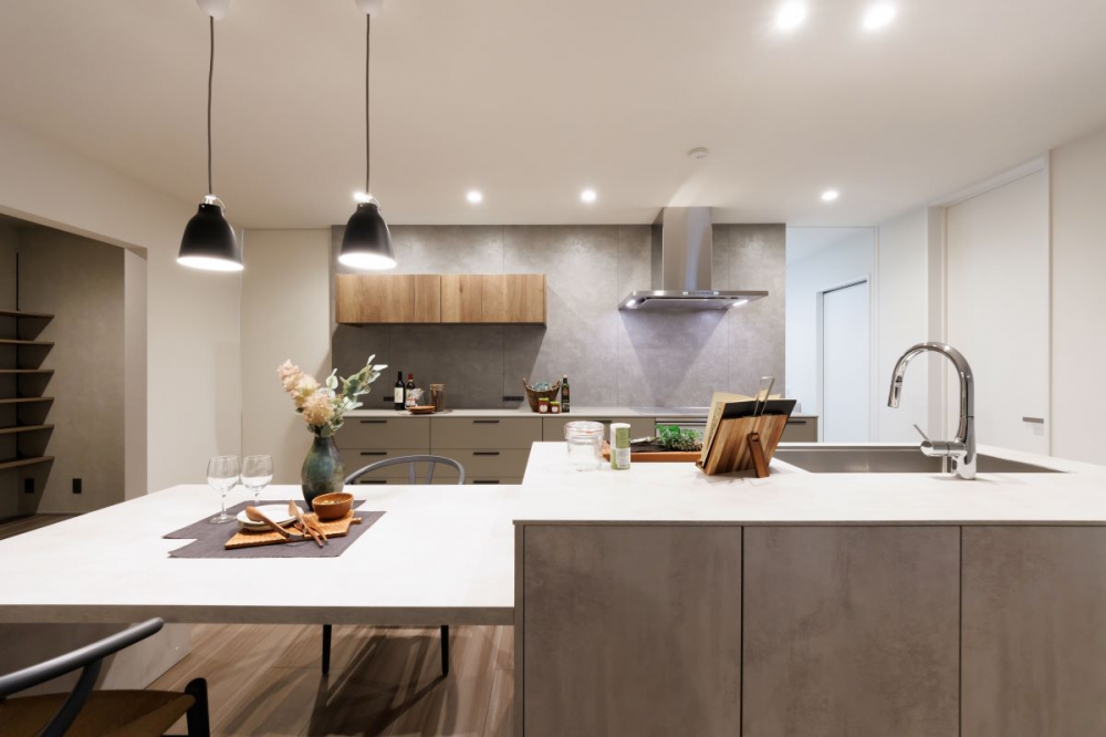 1Fのメインキッチンはモダンで機能的なペニンシュラキッチンになっています。 ダークグレーとステンレスを使用したキッチンに、ナチュラルな木目調のカップボード、白い壁という色の組み合わせが、スタイリッシュでありながらもモダンで落ち着いた雰囲気を作り出しています。