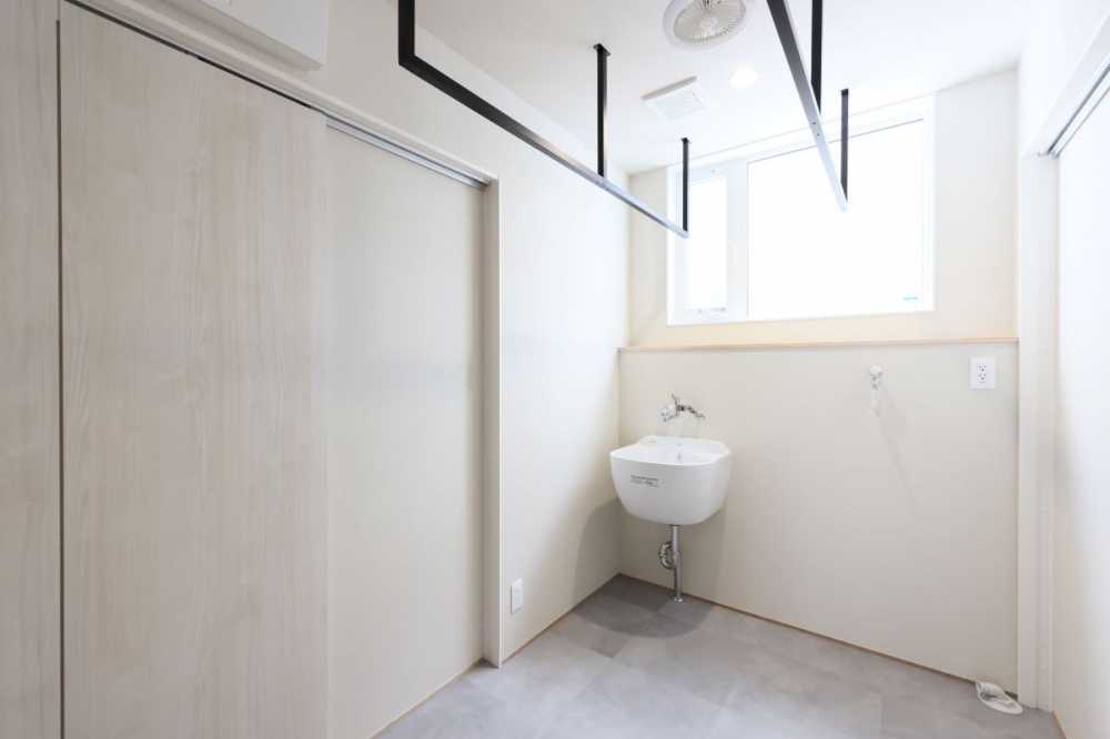 サンルームから脱衣室、浴室へと一直線に繋がる最短の家事動線を実現。 脱衣室を独立させた間取りにより、家族がお風呂を使っていても気兼ねなく洗濯家事ができ、安心なプライベート空間を確保しました。