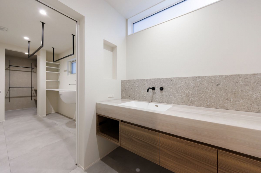 グレーの石目調が美しいホテルライクな洗面空間は、ファミリークローゼットやサンルーム、浴室へと繋がる便利な動線も魅力。 家事の負担を減らしつつ、毎日の身支度を優雅な気分で楽しめる空間に仕上げました。