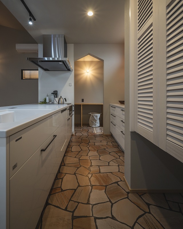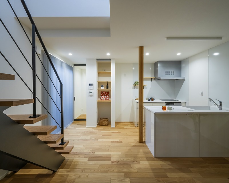 LDKをより広く使うため、2列型キッチンを採用。空間にゆとりがうまれ、家事動線もスムーズになります。キッチン横には、オーブンも置ける収納棚を設けました。