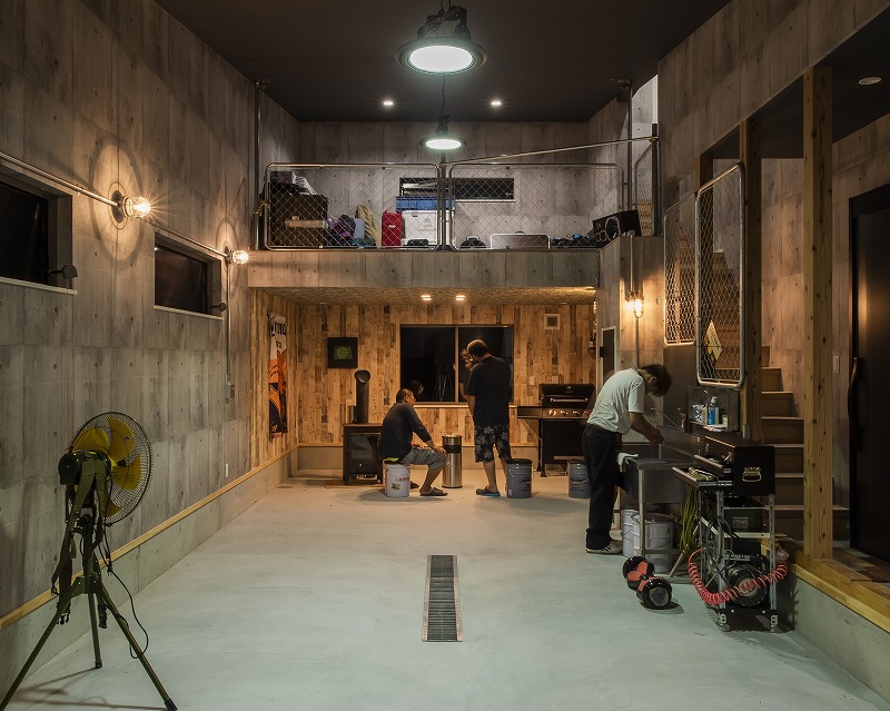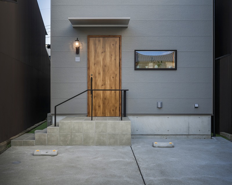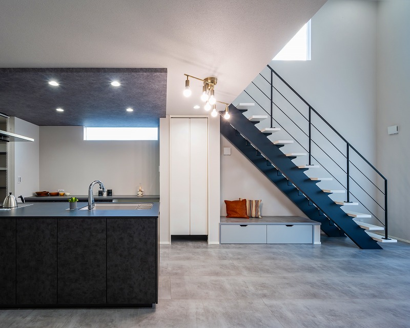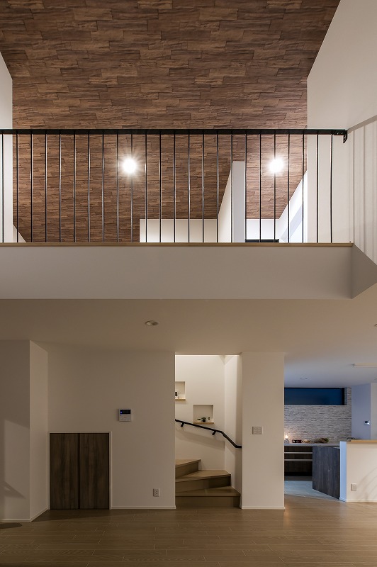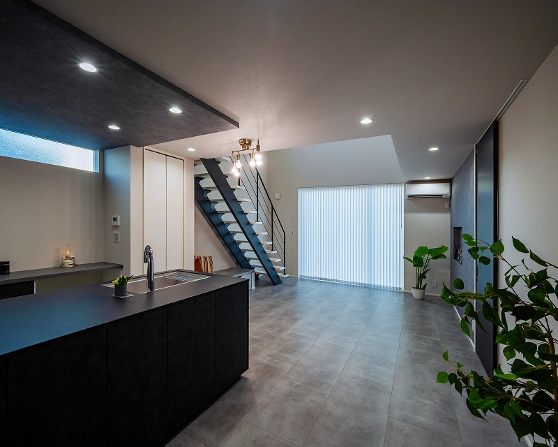 無機質な質感の床やアイアンの手すりが、洗練された雰囲気を演出しながらも、どこか落ち着きを感じさせる設計。