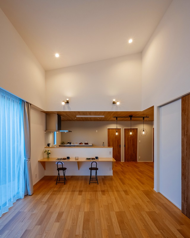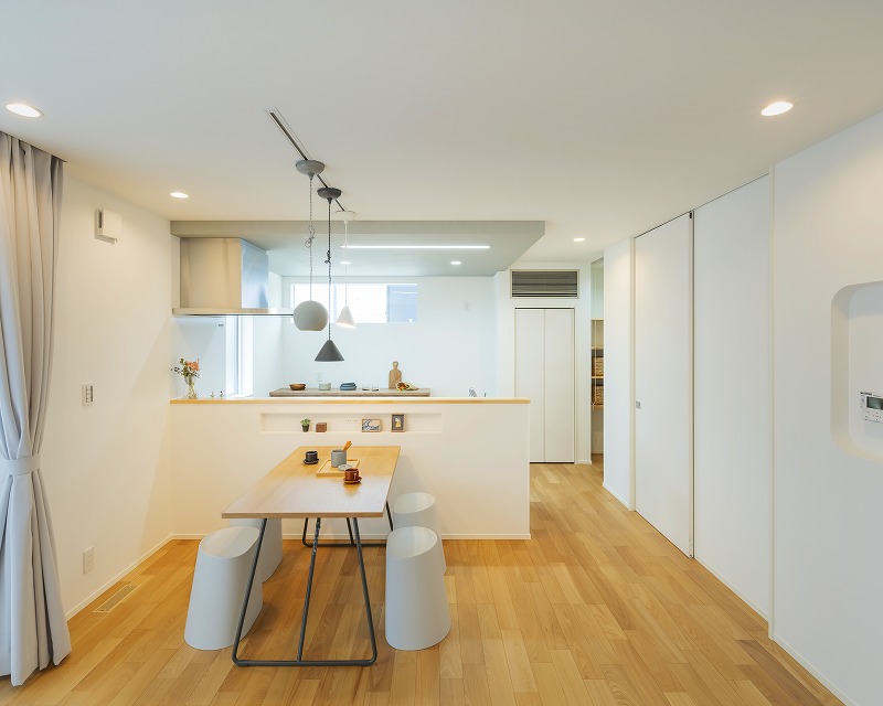 キッチンとダイニングが一体となったLDKは、家族の会話が自然と生まれます。カウンター下のニッチは小物を飾ったり収納したりと便利に活用できます。やわらかな木目の床とペンダントライトが温かみを添え、毎日の食卓をより楽しく演出します。