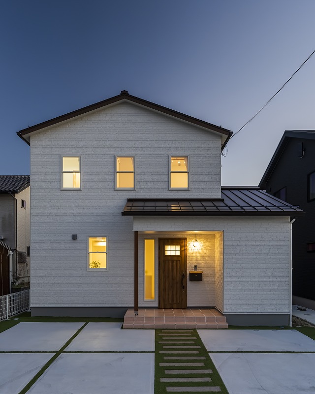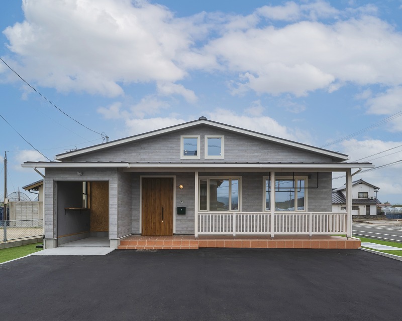 切妻屋根が印象的な外観は、アメリカンスタイルを感じさせるデザイン。正面に広がるカバードポーチは、雨の日でも濡れずに出入りできる実用性を備えながら、家族や友人と腰掛けて語らう憩いの場としても活躍します。木目の温もりを感じる玄関ドアと白い手すりのコントラストが美しく、外と内をゆるやかにつなげる心地よい佇まいです。