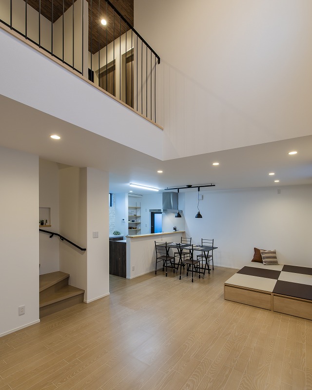 フルフラットキッチンと、タイル調のフローリングが調和する約20帖のLDK。 リビング上は吹抜けとなり開放的な空間となっています。