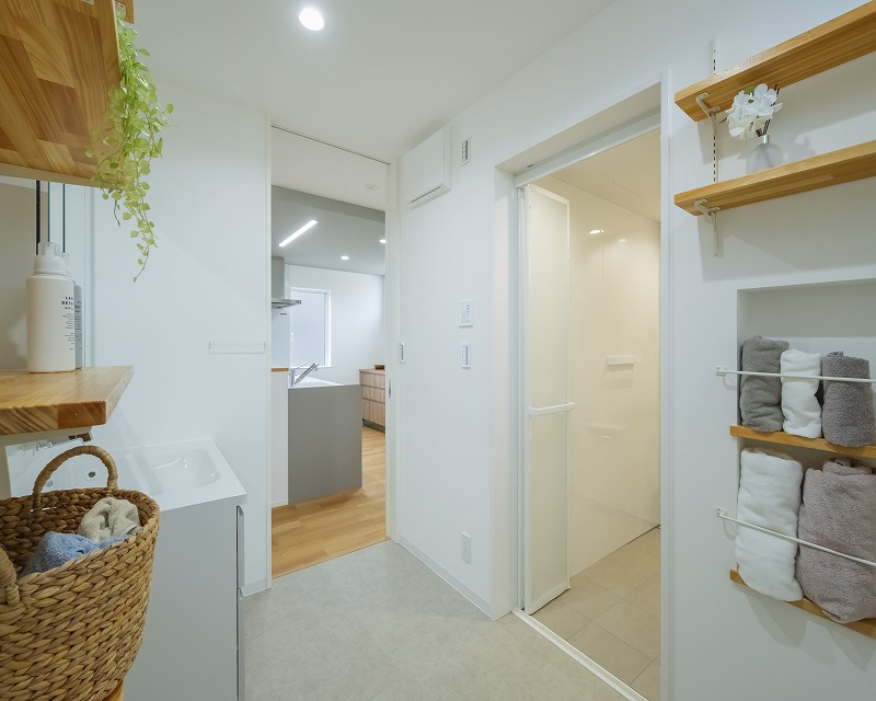 洗面室から浴室、さらにキッチンへとつながる動線は、家事や入浴の支度がスムーズにできる嬉しい設計。可動棚や壁面収納も備わっているので、タオルや日用品をすっきり整理でき、快適さと使いやすさを両立した水まわり空間です。