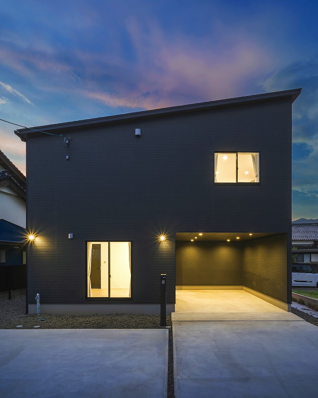 片流れ屋根の形を活かしたスッキリとした外観。 玄関まわりには格子を設け、光や風を取り込みながらも外からの視線をコントロール。カーポートを含めた外構までトータルで計画し、日常の動線に配慮しながら外観の一体感を高めました。