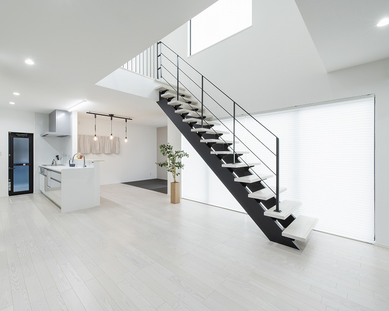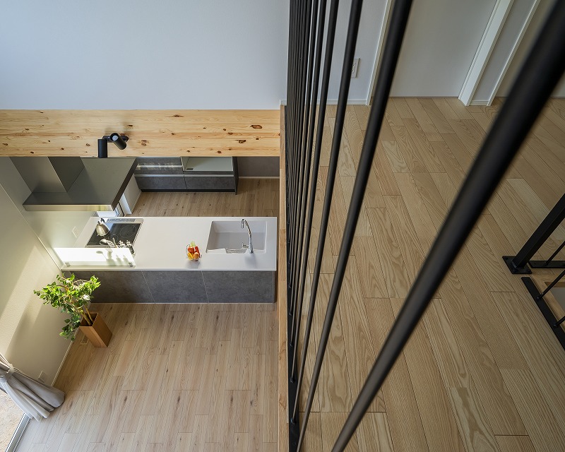 空間のアクセントになるリビング階段。踏板には木の質感、手すりにアイアンを組み合わせることで軽やかな印象に仕上げました。視線が抜けることで圧迫感を抑え、上下階をゆるやかに繋ぐ心地よい空間です。
