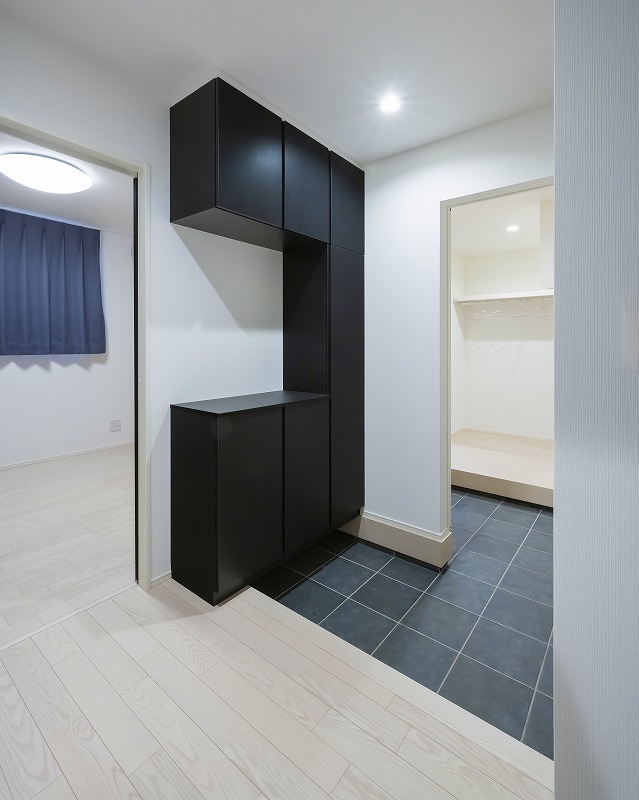 玄関から左右に分かれる2WAY動線を採用。生活と趣味を心地よく分けた、使い勝手の良い玄関です。