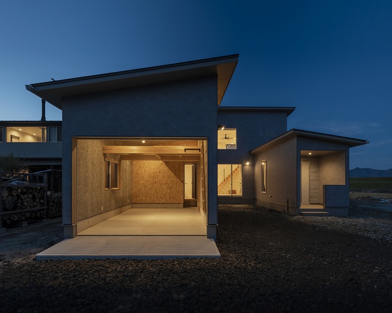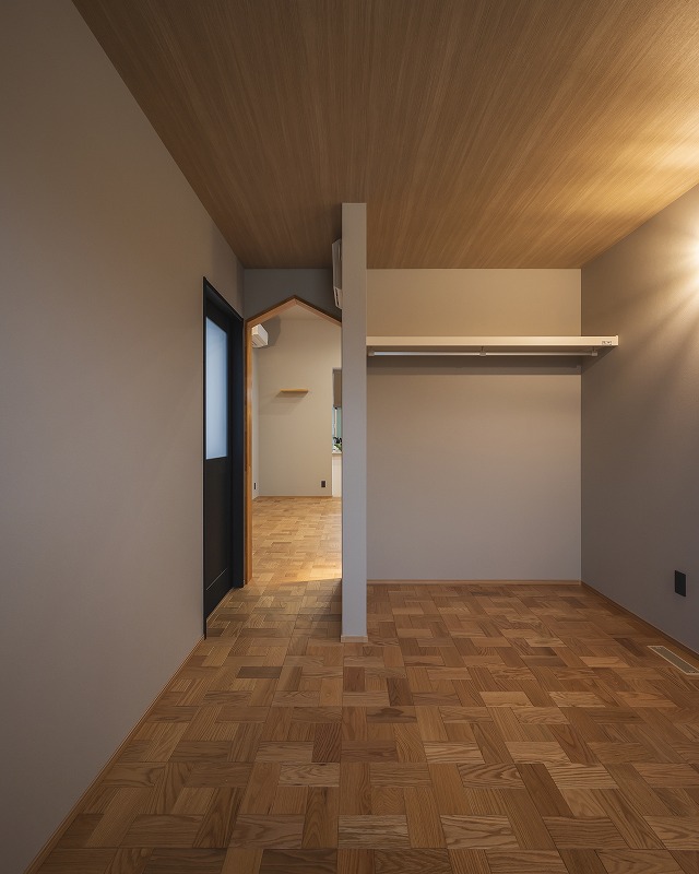 柔らかな光が木の質感を引き立て、住まう人を優しく包み込みます。壁面の間接照明やスポットライトがシンプルな空間に奥行きをもたらし、昼と夜で異なる表情を楽しめるのも魅力です。各部屋への入り口には三角の垂れ壁を採用し、遊び心のあるデザインに仕上げています。