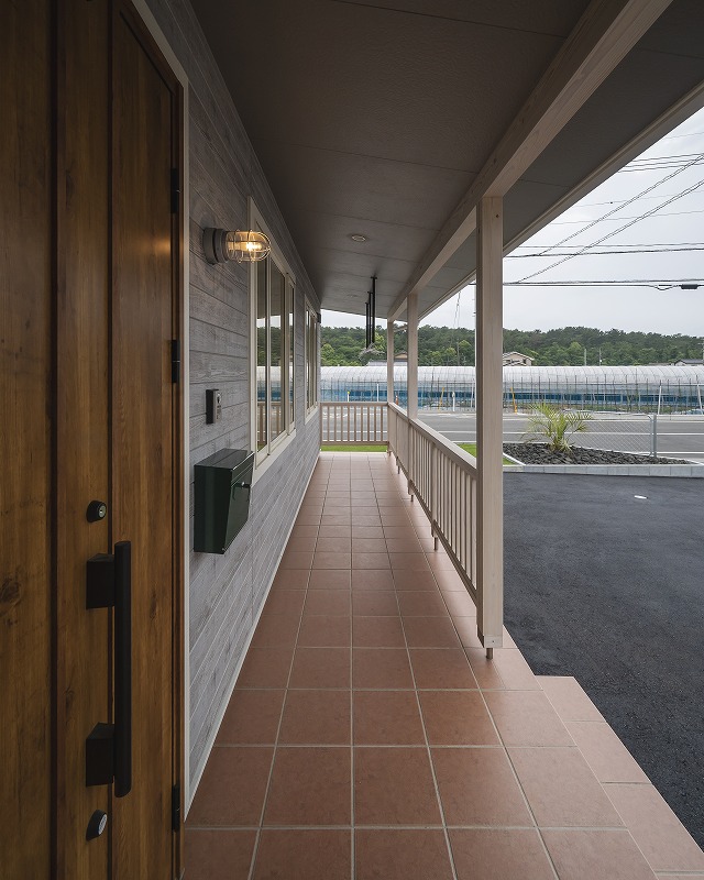 雨の日でも濡れずに出入りできるカバードポーチは、日常の利便性を高めるだけでなく、グリーンやチェアを置いて趣味を楽しめる憩いのスペースです。シンプルなデザインの中に、テラコッタ調のタイルや木目のドア、白い柱や手すりを組み合わせることでリゾートのような開放感が生まれます。
