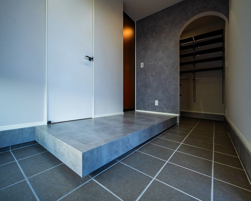 アール垂れ壁がアクセントのシューズクローク。 収納力抜群で、靴だけでなく日常的な小物もすっきり収納できます。