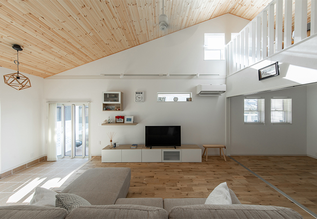 リビングは大きな勾配天井で明るく開放的な雰囲気に仕上げました。