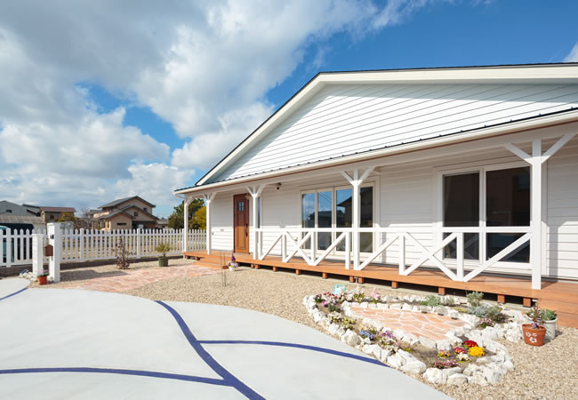 【細部までこだわり抜かれた外観】 青空に映える爽やかなアメリカンスタイル(カリフォルニアスタイル)の外観。定番といえる ラップサイディングと屋根付きのカバードポーチのスタイルも、A様のセンスにより ひと味違ったデザインとなっています。 外観のメインになる外壁から 細かな部材 (破風、鼻隠、軒天など) に至るまで、パースで様々なパターンをご提案し、それを比較検討していただきました。