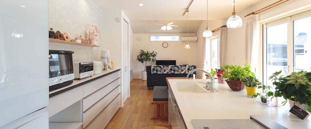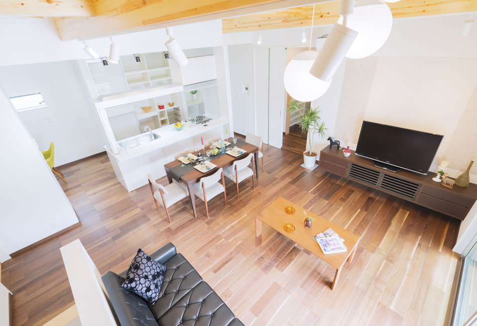 広々な吹き抜けLDKは開放感たっぷりで、作業効率を考えたキッチンスペースは回遊できる動線が魅力。