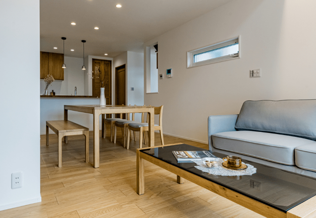 炬燵を置いてゆったり過ごせる広々なリビングの間取りと、床暖房にこだわったお家。