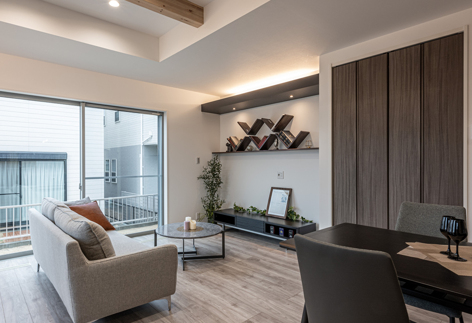 【無骨なシックモダンスタイルのLDK】 美しく洗練された大人の暮らしを予感させるリビング。 風合い豊かなセメント系無垢材の内装ボード「SOLIDO」を装飾し、 天井に間接照明の柔らかい光を当てることにより、シックな空間に優しい表情をプラス。 ステージのような高級感を演出しました。 落ち着いたコントラストの家具が映え、静かに趣味を楽しむ場所として活躍しそうです。