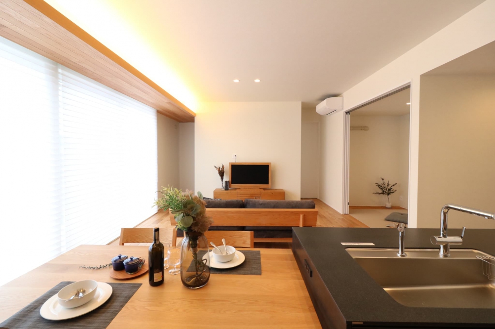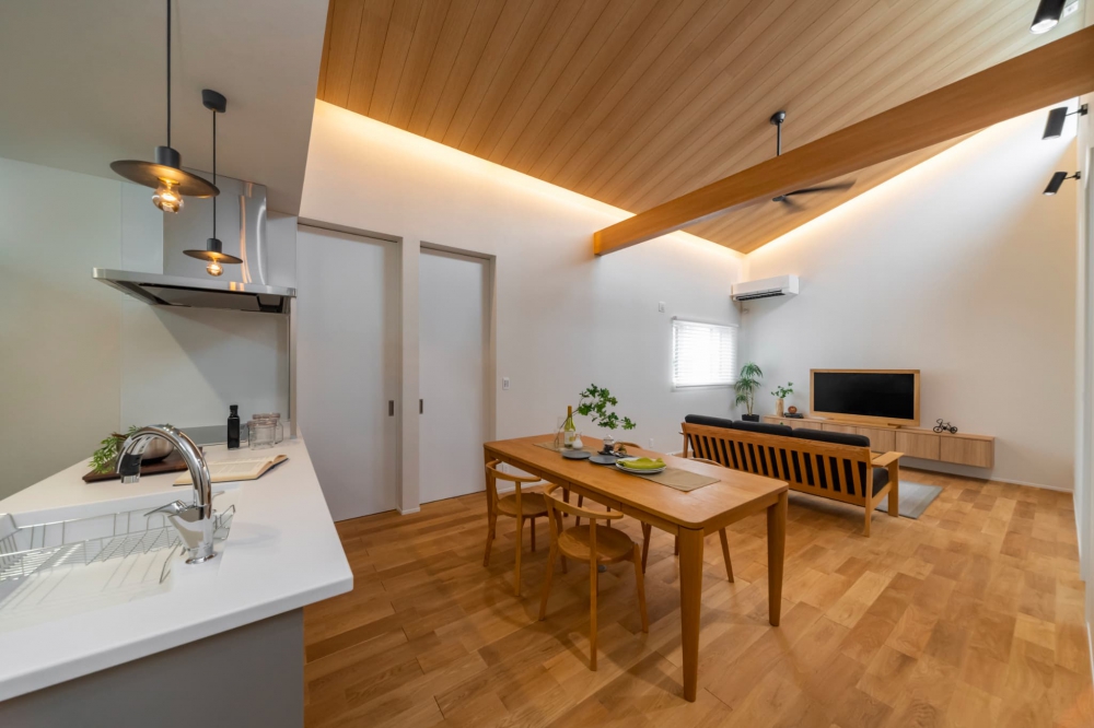 リビング・ダイニングを勾配天井とすること、間接照明にすることで、高さの広がりを強調する空間としました。