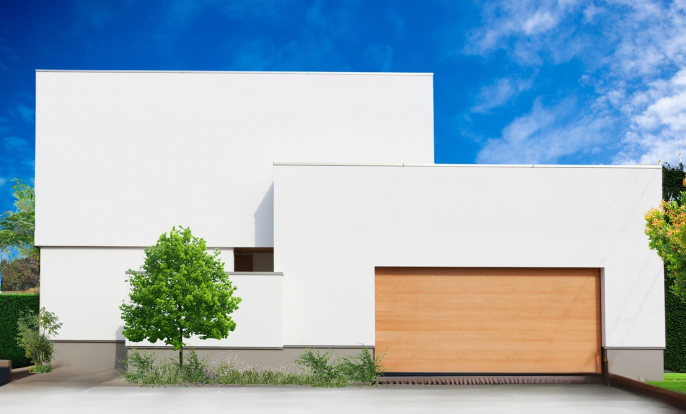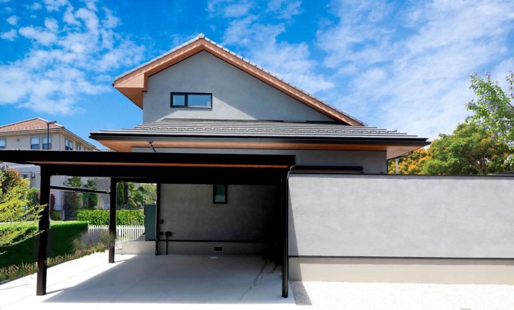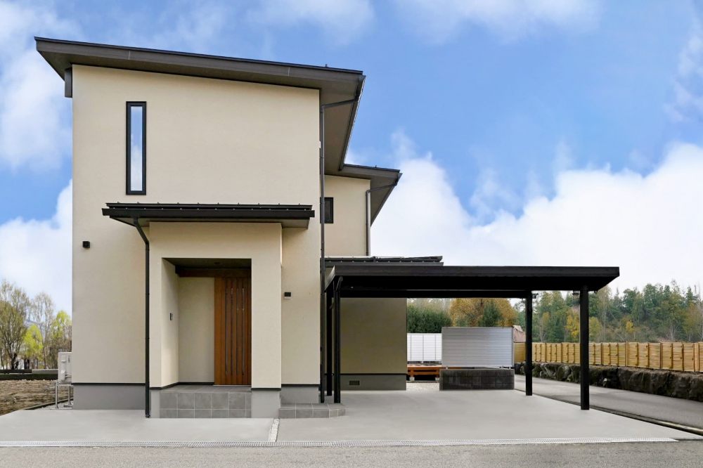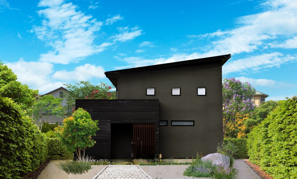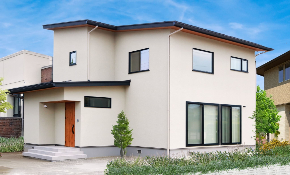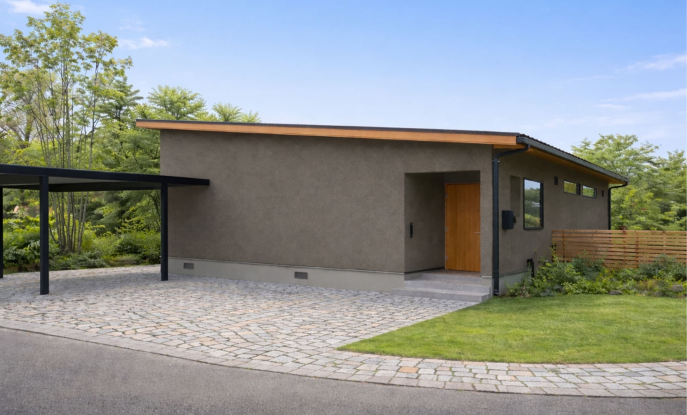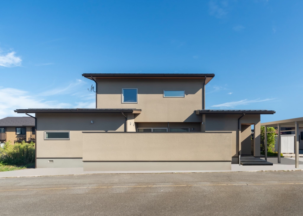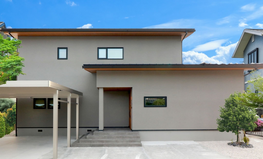 継ぎ目のないモルタル吹付外壁が、外観から室内に統一感を与え、和モダンな雰囲気を演出しています。