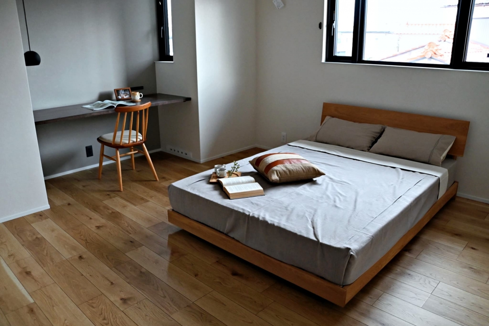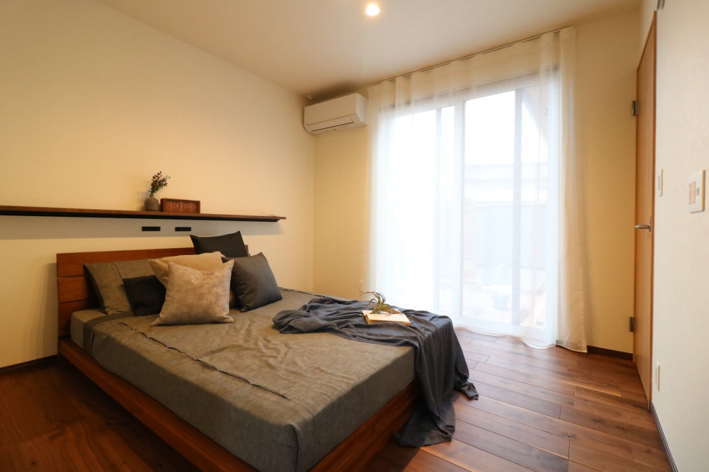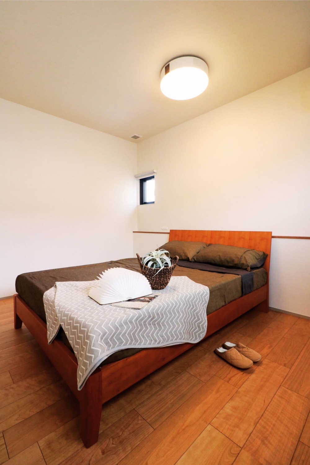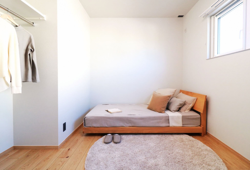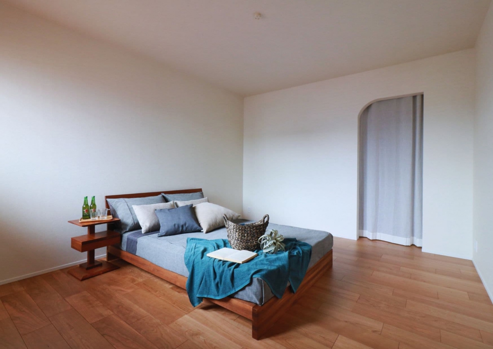 2階の寝室は落ち着きとエレガントさが共存し、ホワイトとグレー、木のコントラストが温かみを感じさせる外観が特徴です。