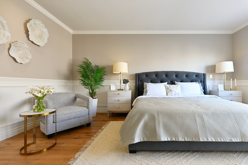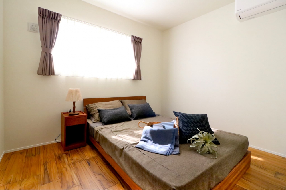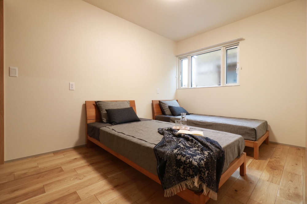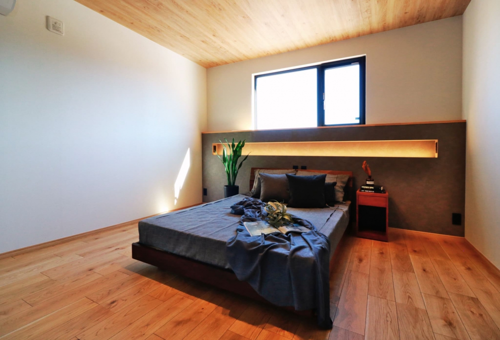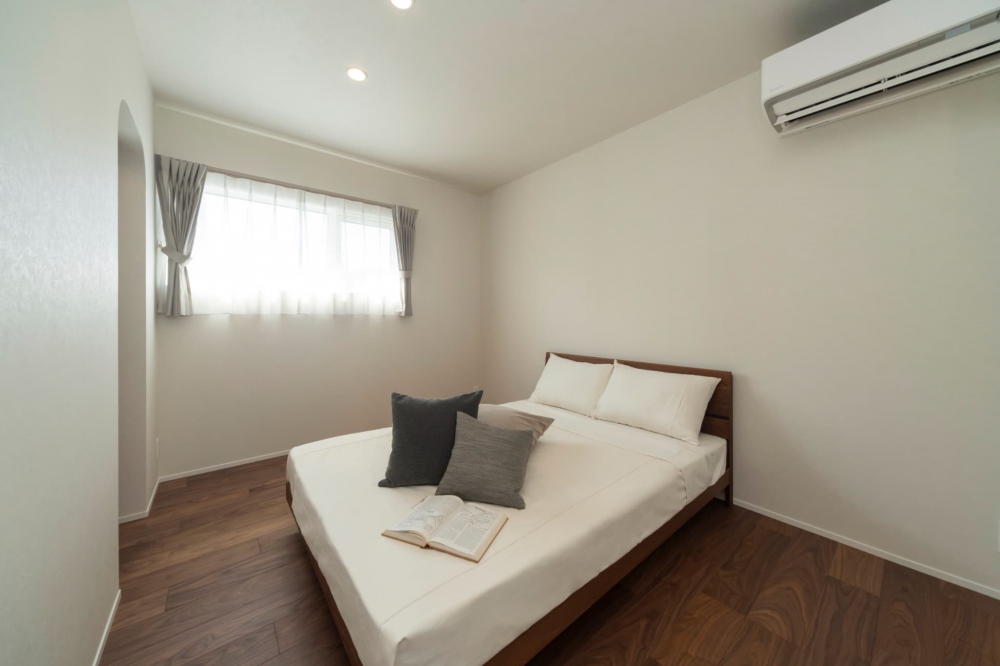 2階の寝室は落ち着きとエレガントさが共存し、ホワイトとグレー、木のコントラストが温かみを感じさせる外観が特徴です。