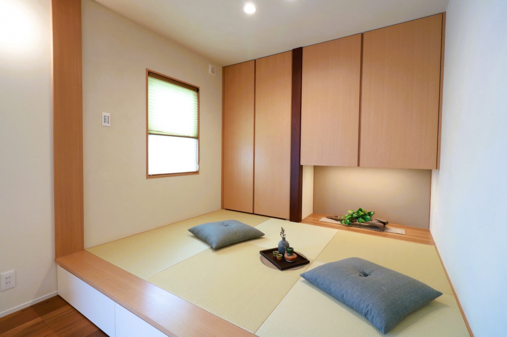 2階には畳コーナーがあり、和の風情を感じるひとときを。広めの納戸は収納力抜群で、家中をすっきりと整理可能。