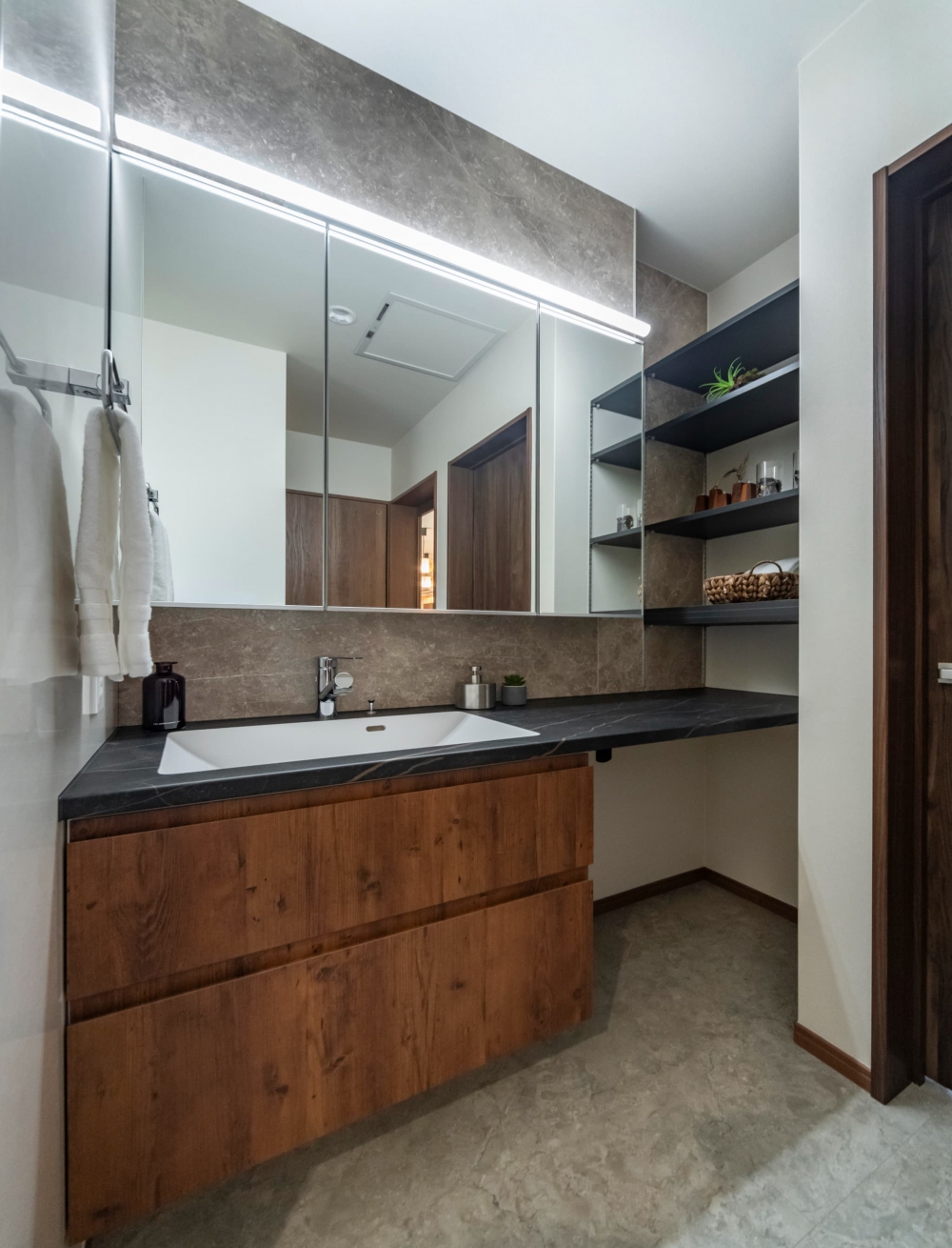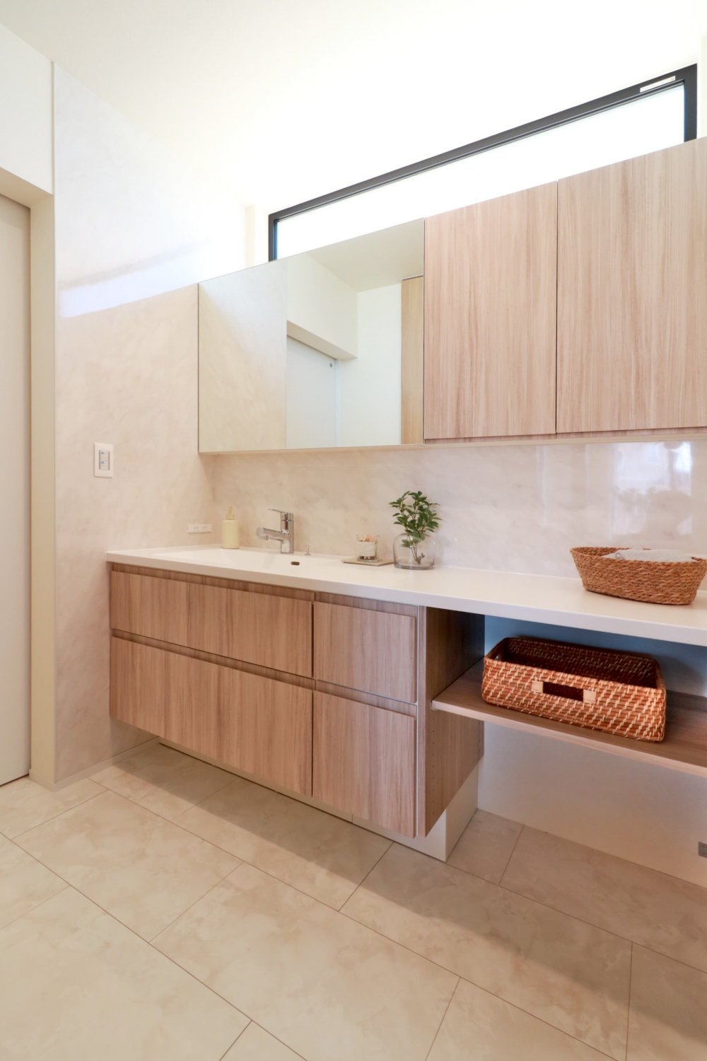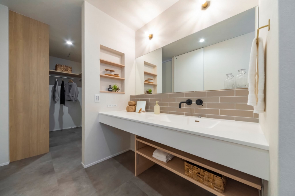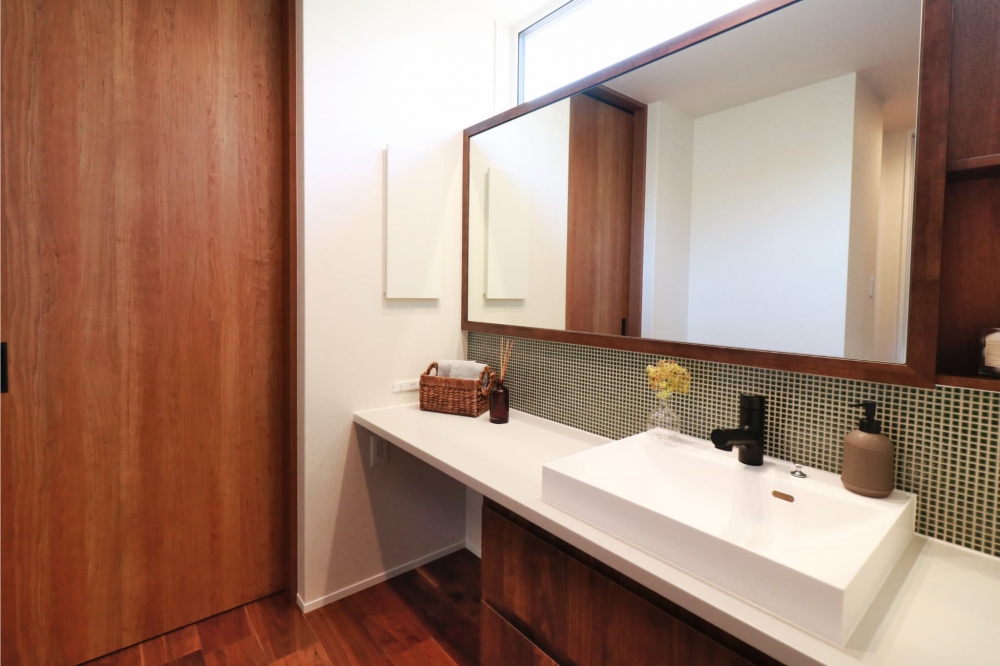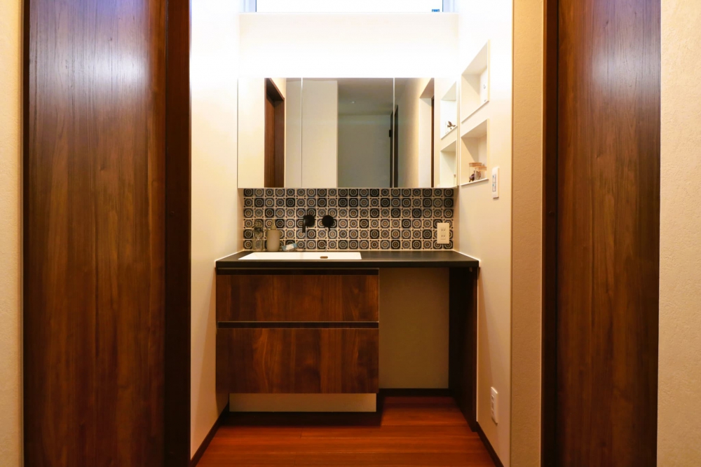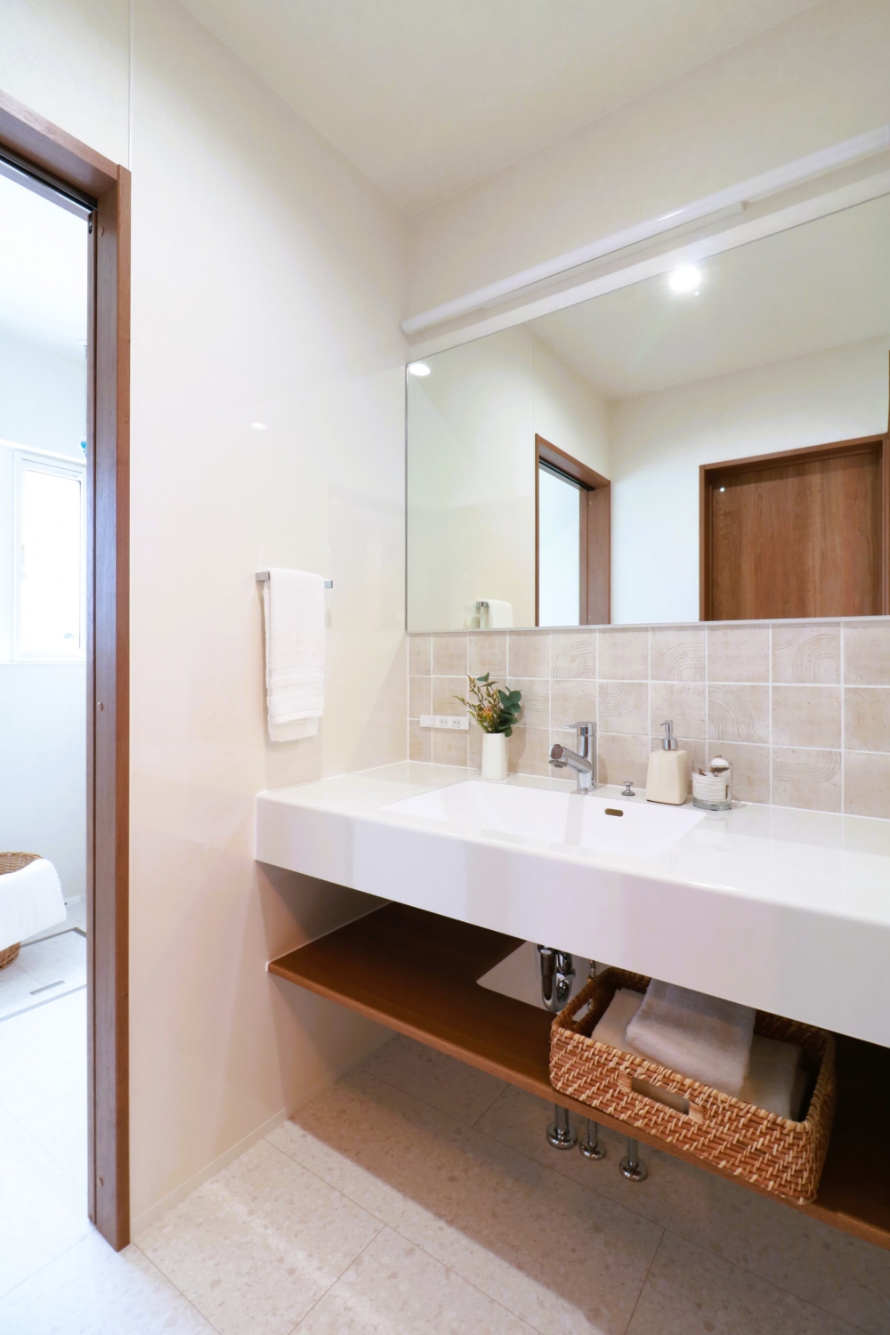 造作洗面には美濃焼タイル「カッセ」を採用し、実用性とデザイン性を兼ね備えた空間を演出。