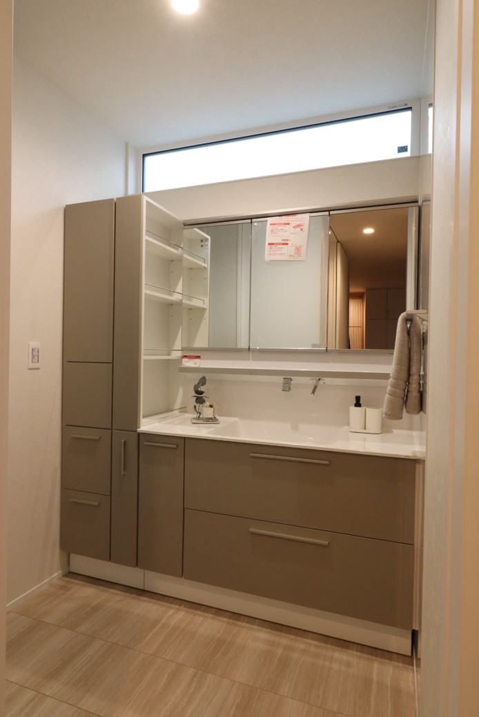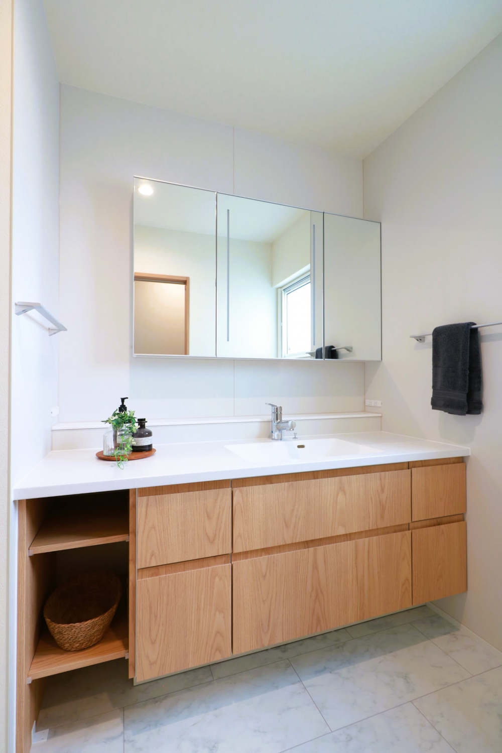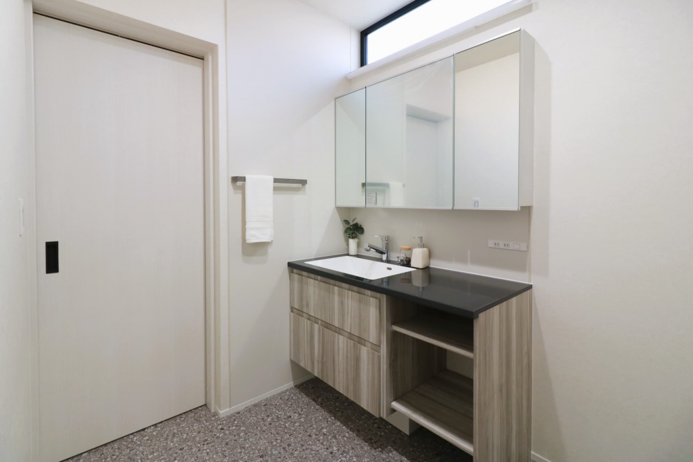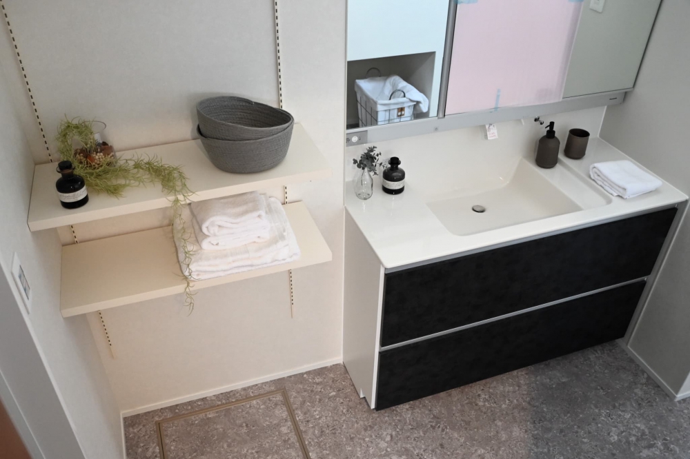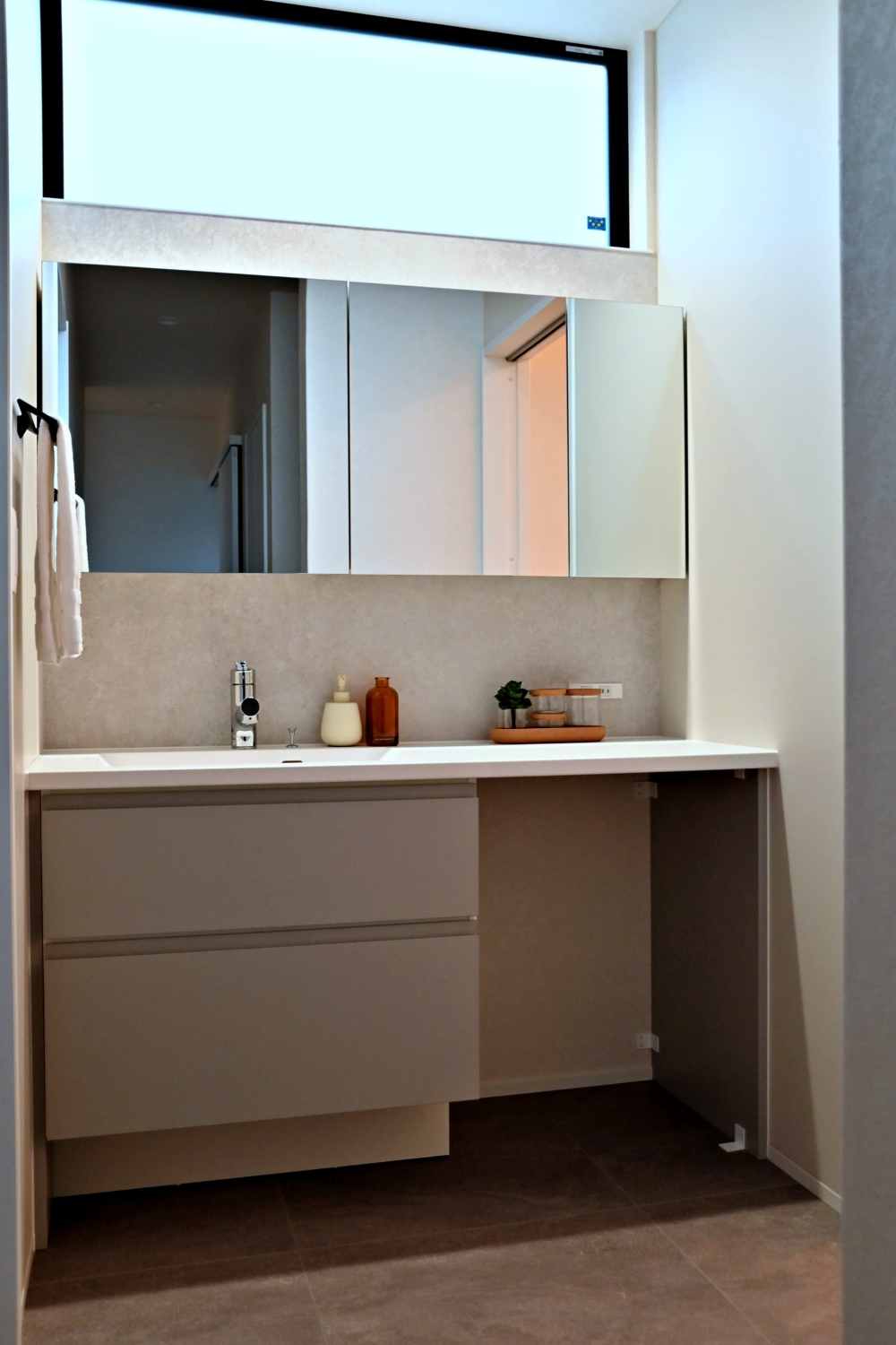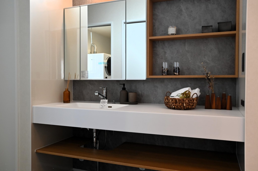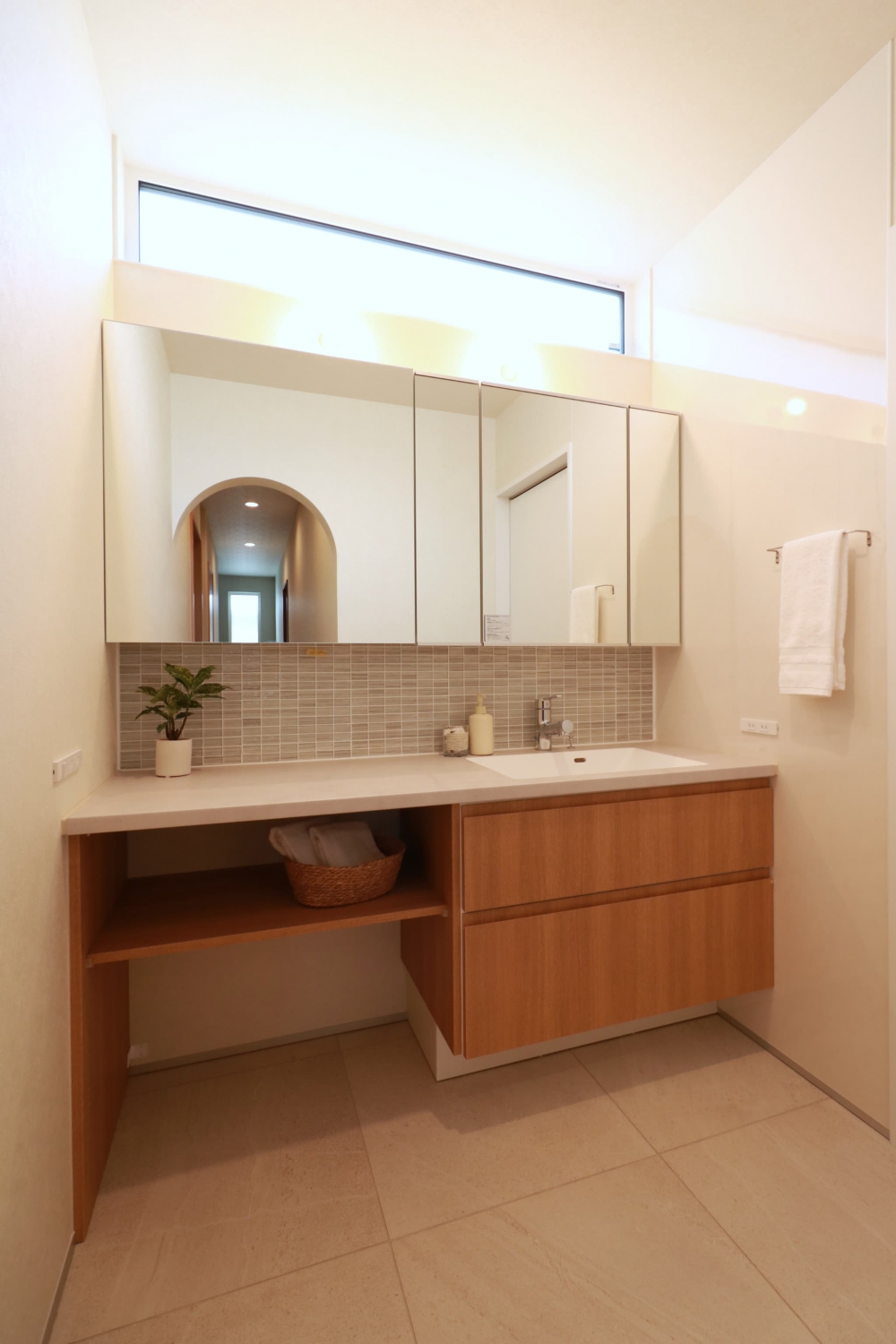 造作洗面には美濃焼タイル「カッセ」を採用し、実用性とデザイン性を兼ね備えた空間を演出。