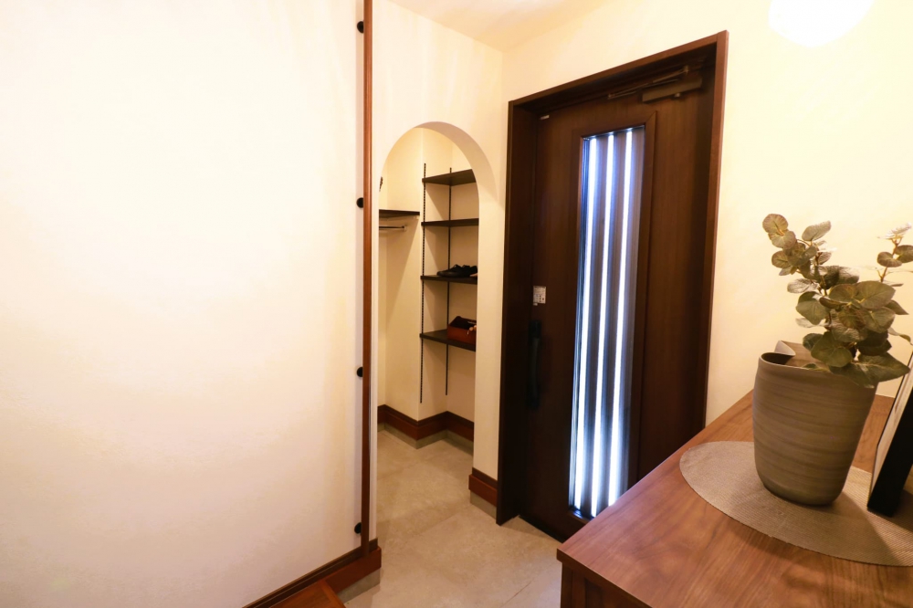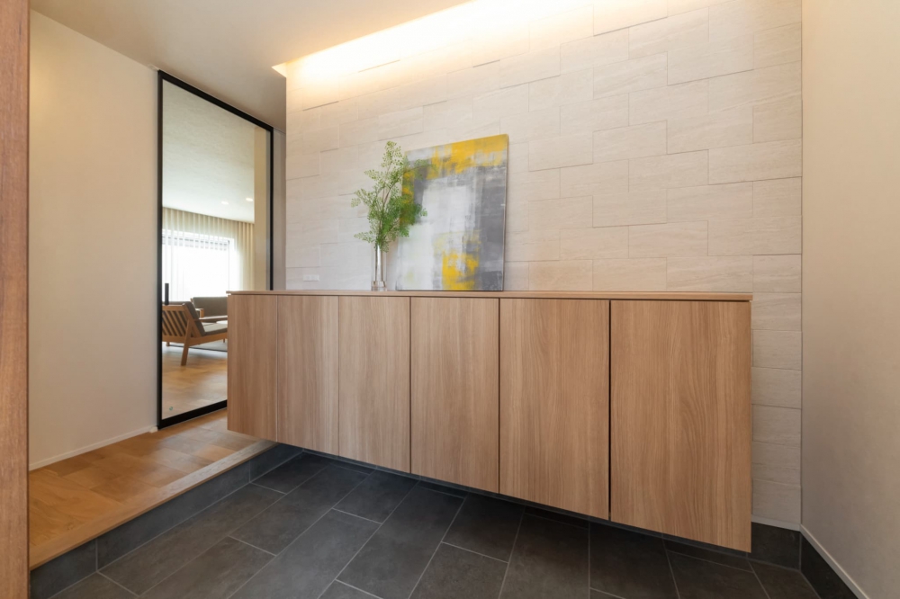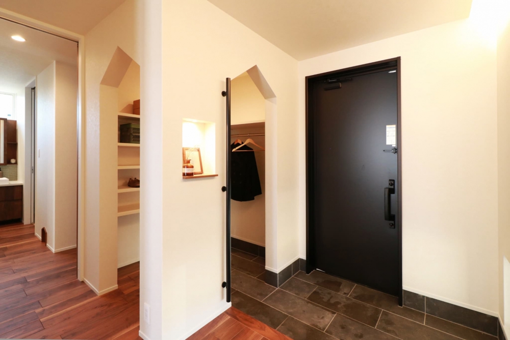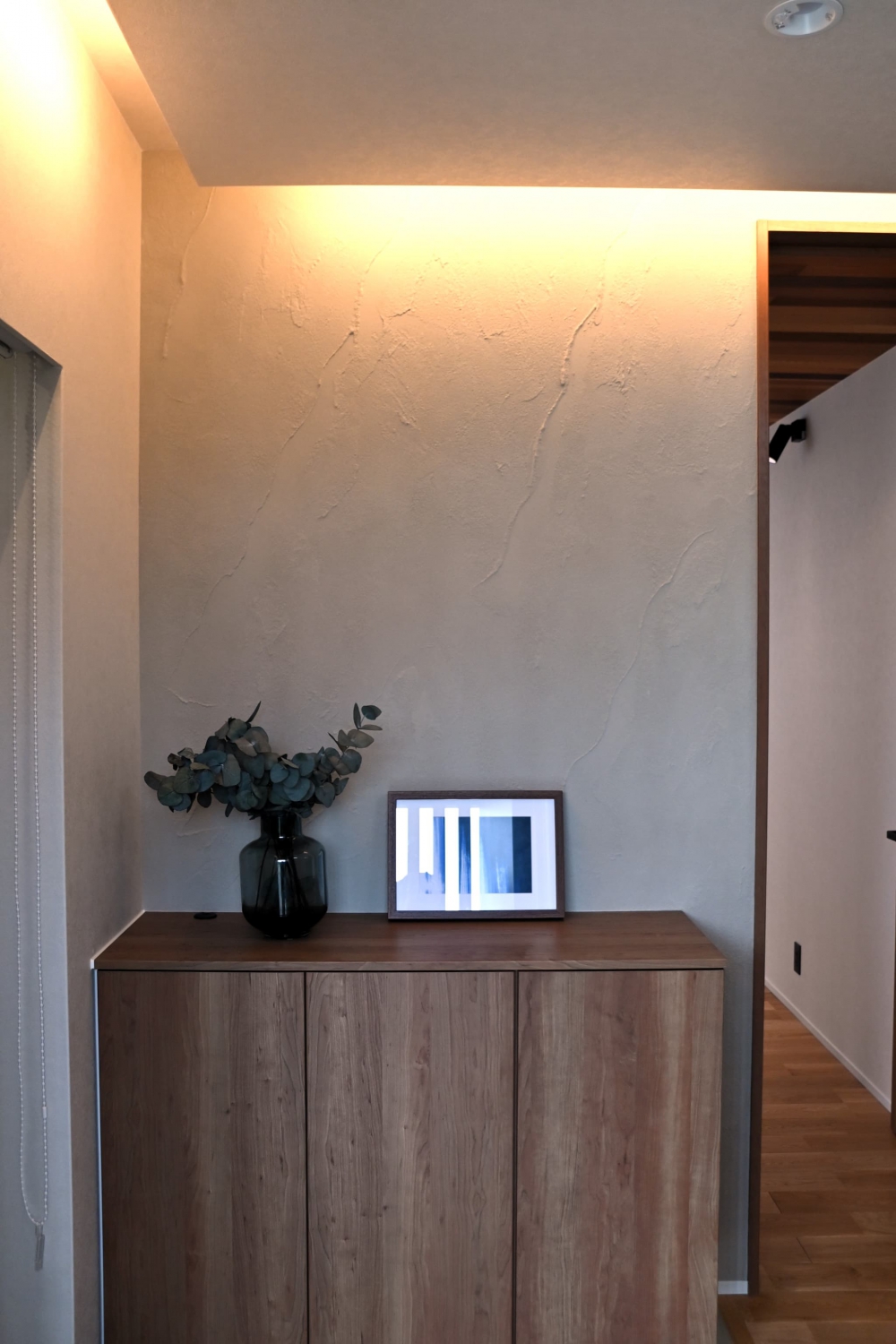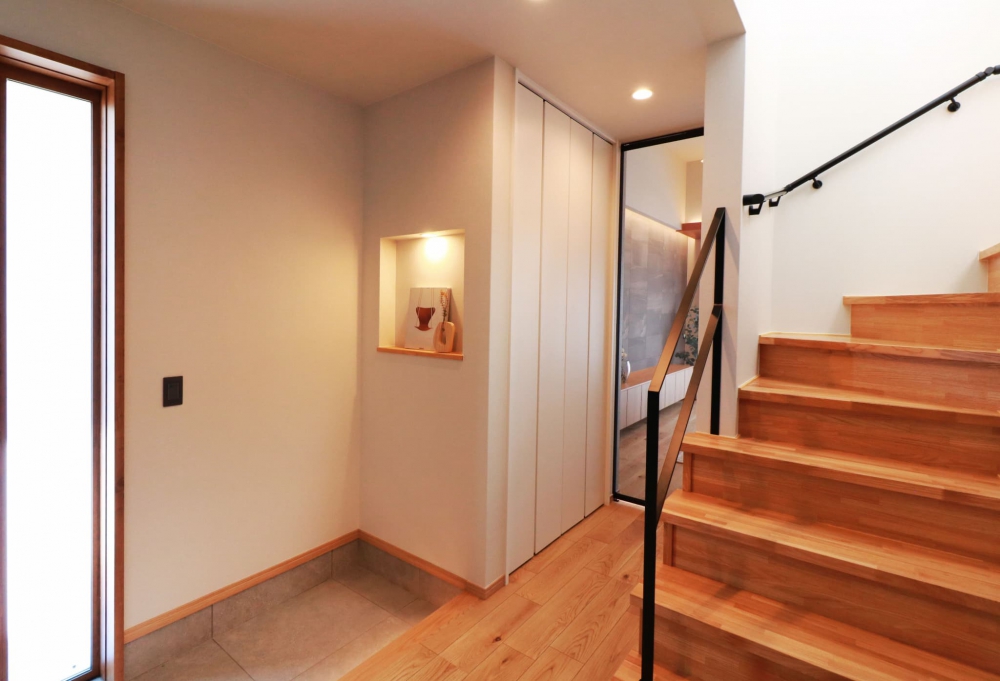 玄関ホールには間接照明や家族の思い出を飾るニッチが配され、洗練されたデザインが随所に施されています。