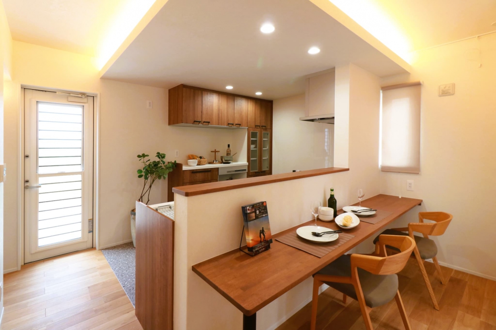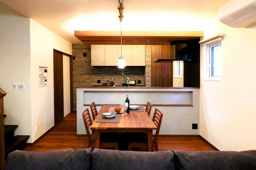 玄関の格子やリビングの小上がり畳による和のテイスト、ウォルナットの木質感と間接照明が演出するモダンな雰囲気が特徴です。