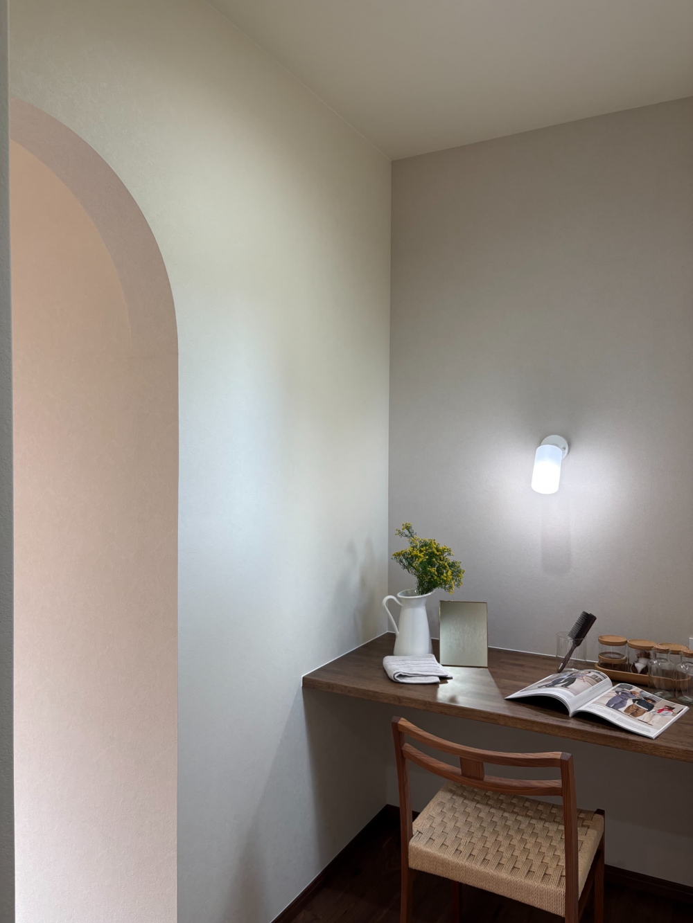床にはナラの無垢材が用いられ、自然の美しさが際立ち、ライトグレーの塗壁がモダンで優雅な雰囲気をもたらしました。