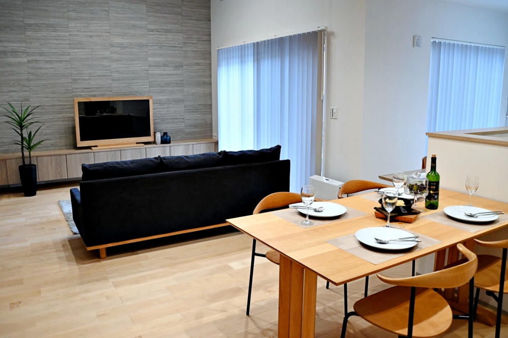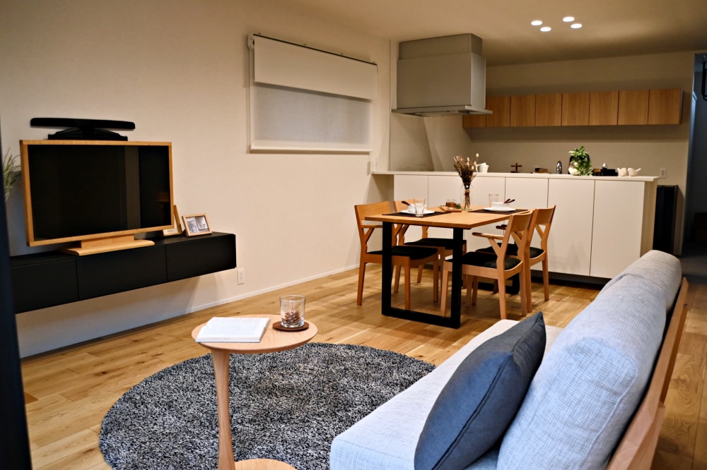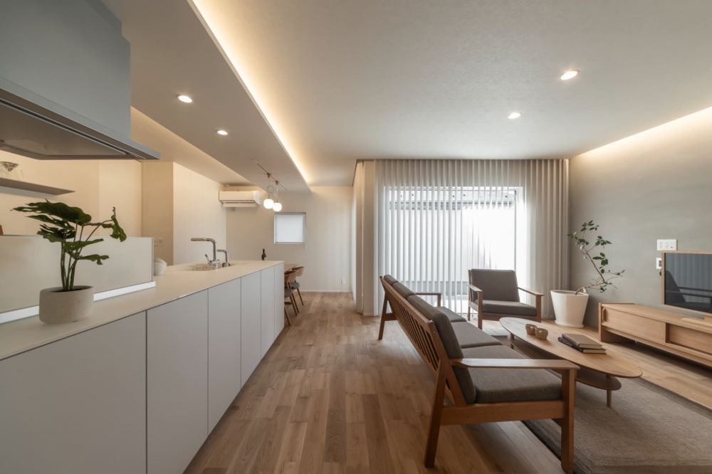 自然光と和モダンが調和する平屋は、四季を感じられるリビングや家事効率を考えた動線設計が特徴です。