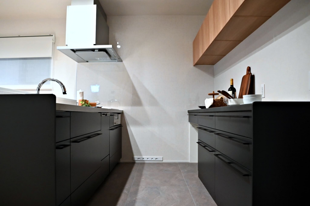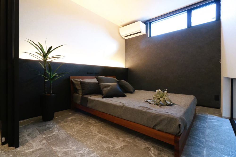 落ち着きを感じる寝室と、インパクトのある真っ黒のキッチンを備えたモダンなLDK。