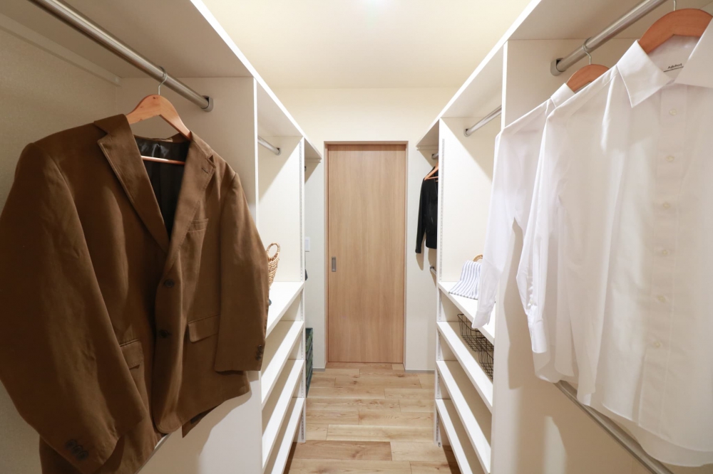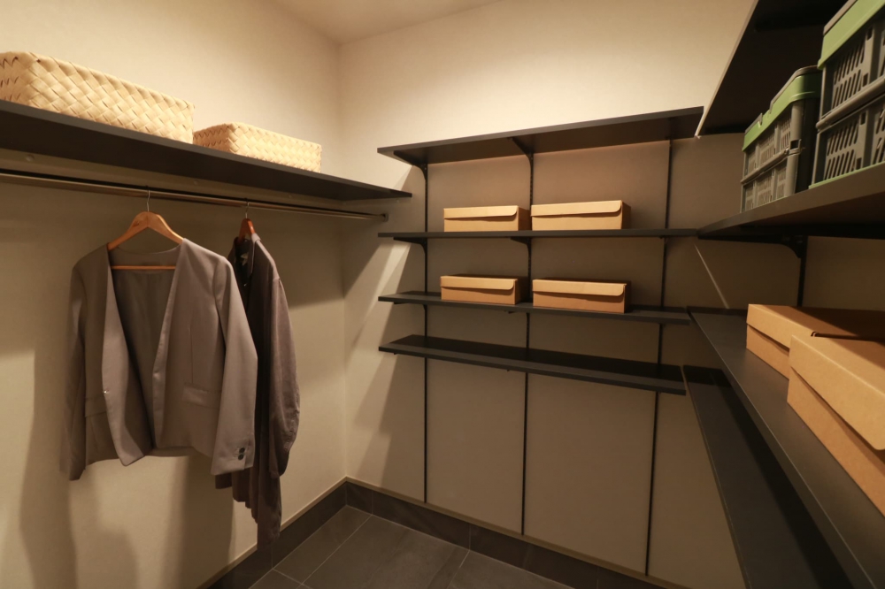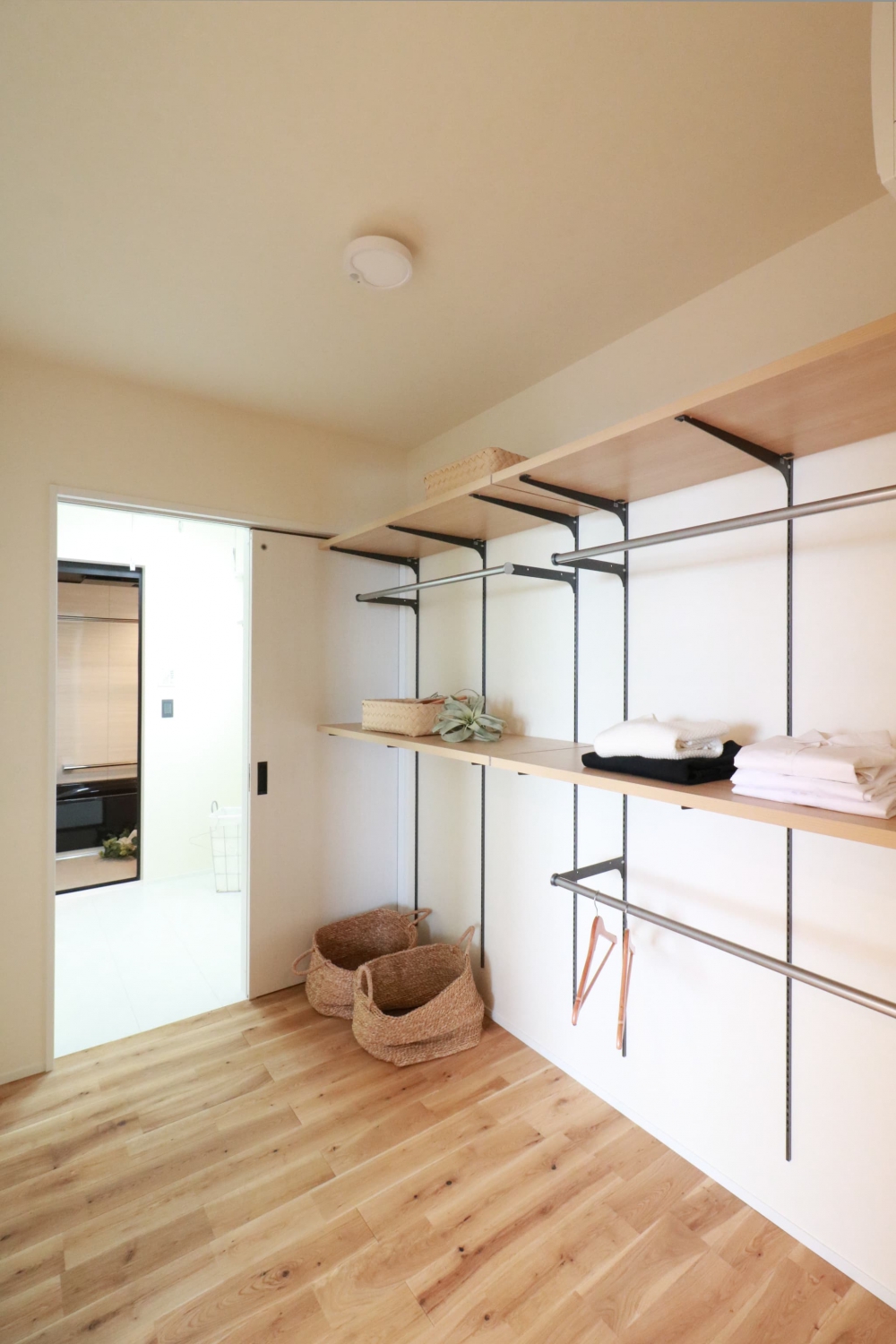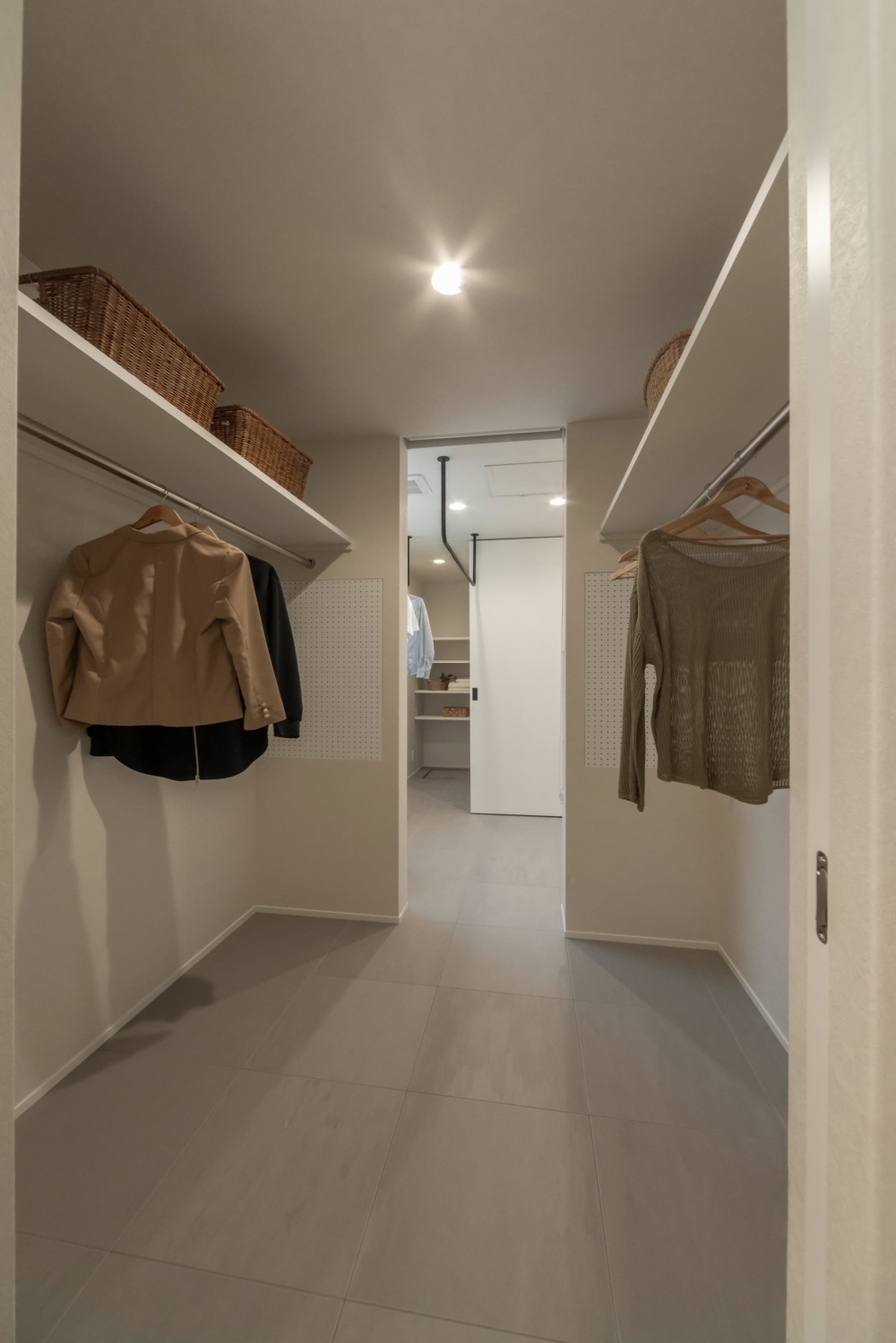 玄関横のクロークは効率的な収納と動線を両立し、寝室併設のウォークインクローゼットは
